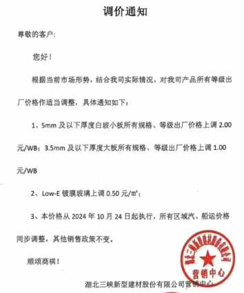 近日网络上流传多家生产玻璃企业的涨价函,包括但不限于三峡新材(600293.SH)、旗滨集团(601636.SH)、中国玻璃(03300.HK)。 南财快讯记者以投资者身份致电三峡新材询问涨价函的真实性,相关人士回应称,请以公告披露信息为准,公司目前生产经营正常。 ![]() △三峡新材调价函,图片来源网络 “在10月之后,玻璃出货明显加快,价格有小幅的回升,存在涨价趋势。”一位不愿具名的业内人士对记者表示。 该人士进一步表示,主要涉及三方面的因素:一是9月以来一揽子政策的发布;二是房地产相关数据回暖,发出积极信号,如销售面积、新开工面积、开发投资金额等跌幅同比均有所收窄,国庆假期一手房、二手房销量都有回升;三是进入“金九银十”的传统旺季。 隆众资讯统计的浮法玻璃数据也验证涨价的趋势,截至10月24日,沙河地区5mm大板价格至1233元/吨,环比上周末上涨43元/吨,涨幅3.61%;山东地区5mm大板价格至1240元/吨,环比上周末上涨30元/吨,涨幅2.48%。 此外,中信建投期货能化研究员胡鹏也对记者表示,近期玻璃价格强势,本周玻璃期货主力合约上涨逾10%,现货也出现调涨信号。 胡鹏分析称,供应端方面,因前期亏损明显,三季度浮法玻璃冷修增加,最新在产日熔量下降至16.2万吨附近,较年内峰值下降约8%,同比下降约5%,供应端压力明显减弱。四季度仍有部分产线计划放水冷修,供应端利好有望持续释放。 需求端方面,10—11月为传统需求旺季,下游深加工订单环比有一定改善。供减需增影响下,行业预期改善,中下游备货力度加大,10月以来玻璃上游库存连续数周下降,最新库存为285万吨。 不过,他指出,期货价格升水现货幅度较大,政策落地尚需时日,价格快速拉涨后需注意风险。