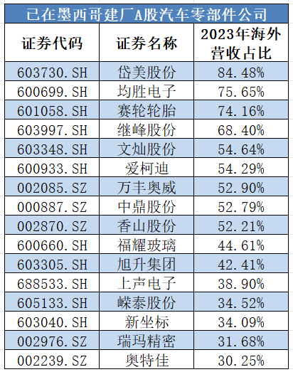 据《21世纪经济报道》报道,当地时间10月15日,特朗普在芝加哥经济俱乐部的演讲中表示,如果他再次当选,将对包括欧洲和墨西哥在内的进口汽车征收高额关税,强化美国的贸易保护政策。他表示,“如果我成为总统,我将对来自墨西哥的汽车征收100%、200%、2000%的关税。他们不会向美国出售一辆汽车”。 特朗普的言论迅速引发热议。不过,赛轮轮胎和银轮股份相关工作人员在接受《每日经济新闻》记者采访时均表示,“即使特朗普成功当选,并真正施行200%加征关税,我们也不会放弃美国市场,而是通过其他方式去实现”。 10月24日,北方工业大学汽车产业创新研究中心主任、教授纪雪洪在接受记者采访时表示,特朗普这一举动的目的主要体现在两方面:一是为了竞选拉票;二是希望美国制造业能够回流,提高美国就业和汽车产业的发展能力。“希望汽车产业尽量能够在美国建厂,是特朗普一贯的政策导向。”纪雪洪分析称。 超20家汽车零部件上市公司在墨西哥建厂 “墨西哥不仅毗美国消费市场,更是拥有进入美国和加拿大国家的最优惠政策。”全国乘用车市场信息联席会秘书长崔东树称,这是其吸引中国汽车企业在当地建厂的重要原因之一。 作为北美自由贸易区成员国,墨西哥所具有的关税优势也是吸引中国企业的重要因素。根据《美国-墨西哥-加拿大协定》,诸多门类的产品从墨西哥出口美国、加拿大可享受较低关税甚至零关税。 中国社会科学院拉丁美洲研究所经济研究室主任岳云霞也表示,墨西哥对外广泛签署的自由贸易协定使其拥有相对开放的贸易投资环境及较广阔的全球自由贸易网络,这对中国企业而言无疑具有较强的吸引力。 公开数据显示,墨西哥约拥有900家Tier1企业(汽车零部件一级供应商),但二线供应链企业和三线供应链企业仍非常短缺,按照1:10:10的比例推算,将提供上万家供应链企业的市场空间。 据国泰君安证券、民生证券和西部证券统计,目前我国已经在墨西哥建厂的A股汽车零部件公司超过20家,其中2023年海外营收占比超过30%的有16家。 ![]() 图片来源:每经投研院制表 作为全球汽车零部件供应商和技术服务提供商,均胜电子于2015年通过收购Quim GmbH获得了其在墨西哥的生产基地。2016年,均胜电子又通过收购KSS公司获得了其在墨西哥的生产基地。 “北美是我们在墨西哥建厂后布局的一个非常重要的市场。”均胜电子相关工作人员在接受记者采访时坦言,在整个行业中,一级零部件供应商、整车厂等大多数企业都会有类似的布局。 赛轮轮胎相关工作人员也坦言,赛轮轮胎在墨西哥建厂的目的是加快全球化布局进程,希望产品能进入北美区域和其他国家销售。 公开信息显示,赛轮轮胎是国内首家A股上市的民营轮胎企业,也是首家在海外建厂并最早在海外两个国家拥有规模化轮胎生产基地的中国企业。2024年上半年,赛轮轮胎持续推进建设墨西哥、印度尼西亚等轮胎项目建设。 2023年12月16日,赛轮轮胎发布公告称,公司全资子公司SAILUN INTERNATIONAL HOLDING (SINGAPORE)PTE.LTD.与墨西哥当地企业TD INTERNATIONAL HOLDING, S.A.P.I.DE C.V.签署了《合资企业协议》,双方拟在墨西哥成立合资公司,投资2.4亿美元建设年产600万条半钢子午线轮胎项目。同时,合资公司未来还考虑建设年产165万条全钢子午线轮胎项目。 “墨西哥工厂生产的产品,一部分将在墨西哥市场销售,另一部分则希望销往美国、加拿大等北美市场。”上述赛轮轮胎相关工作人员表示,由于当前工厂产能还不高,即使不进入美国市场,也完全可以在墨西哥市场消化掉。