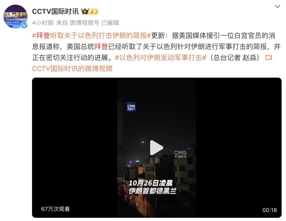 中东突变。 当地时间10月26日凌晨,以色列对伊朗发动袭击。最新消息显示,以色列对伊朗的打击行动已经结束,以色列方面表示,以军当天完成了对伊朗的袭击并实现了既定目标。 伊朗民航组织宣布,当地时间10月26日上午9点、也就是北京时间下午2点起,伊朗全境机场将恢复航班运营。此前,伊朗民航组织宣布暂停伊朗所有航班,直到另行通知。 对于以色列的袭击,伊朗方面表示,袭击大部分被拦截,仅对部分地区造成有限破坏。据知情人士透露,伊朗“准备回应”以色列对该国的报复性袭击。而以色列方面则警告,如伊朗“开启新一轮升级”,以方“将回应”。 美国国防部证实,美国国防部长奥斯汀与以色列国防部长加兰特通电话。奥斯汀收到了以军袭击伊朗的更新通报。奥斯汀强调,“美国加强了在中东地区的军力部署,以保护美方人员、以色列和该地区的合作伙伴。” 出动百余架飞机 以色列国防军当地时间26日早间发表声明称,以军当天完成了对伊朗的袭击并实现了既定目标。 ![]() △以军发言人哈加里发布袭击结束的视频声明(视频截图) 据悉,以军出动了包括F-35在内的百余架不同型号飞机袭击伊朗。 据美国“阿克西奥斯新闻网”报道,美国和以色列官员称,以色列对伊朗发动了三波袭击。按照该新闻网的报道,以军第二波和第三波攻击的重点是伊朗的导弹和无人机基地和生产基地。而按照以色列媒体稍早前报道,以军第一波袭击针对的是伊朗的防空系统。 以色列国防军发言人哈加里在当天发表的视频声明中表示,以军对伊朗的袭击已结束。哈加里称,以军精准袭击了对以色列构成直接威胁的伊朗军事设施,完成了任务。 ![]() △以军发布以色列国防军总参谋长哈莱维(左)指挥对伊朗袭击的视频(视频截图) 根据以军的声明,以空军战机袭击了伊朗的导弹生产工厂、地对空导弹阵列及其他设施,所有以军战机均已安全返回以色列。 内塔尼亚胡在一地下设施指挥行动 以色列安全内阁25日晚间通过电话会议批准了对伊朗的袭击。以色列总理内塔尼亚胡和国防部长加兰特在一处地下设施指挥此次袭击。 ![]() 另据法新社26日最新消息,以军对伊朗发动报复性袭击之际,以色列总理内塔尼亚胡正与其他以色列高官一起评估安全局势。 报道说,以色列总理办公室发表声明称,“内塔尼亚胡总理正在(国防部的)特拉维夫基里亚军事基地,与以色列国防部长、以军总参谋长、情报和特勤局(摩萨德)局长以及国家安全总局(辛贝特)局长一起,对安全局势进行评估”。 伊朗:造成有限破坏 当地时间26日,伊朗防空部门发布公告表示,尽管伊朗已经警告以色列不要采取任何冒险行动,但以色列仍在26日凌晨袭击了伊朗德黑兰省、胡齐斯坦省、伊拉姆省部分军事中心,袭击大部分被拦截,仅对部分地区造成有限破坏。目前该事件仍在调查中。 ![]() 当天凌晨,伊朗首都德黑兰附近连续传出多次爆炸声。伊朗德黑兰省防空部门表示,当天凌晨听到的巨大爆炸声,是源于伊朗防空系统应对以色列针对德黑兰省之外的三处地点的行动。 伊媒称伊朗已准备好回应以色列侵略以军警告 据伊朗塔斯尼姆通讯社报道,知情人士表示,正如此前宣布的那样,伊朗已准备好对以色列的侵略行为做出回应。 知情人士称,伊朗保留对任何侵略做出反应的权利,毫无疑问,以色列的任何行动将面临适当回应。 据法新社最新消息,以色列军方发表声明警告伊朗,如果让局势开始新一轮升级,伊朗将“付出沉重代价”。 报道说,以军发言人哈加里在一份声明中称,“如果伊朗政权犯下(让局势)开始新一轮升级的错误,我们将有义务作出回应。我们的信息很明确:所有威胁以色列并试图将该地区局势拖入更大规模升级的人,都将付出沉重代价”。 美防长称将增强兵力部署保护以色列 据美国媒体援引一位白宫官员的消息报道称,美国总统拜登已经听取了关于以色列针对伊朗进行军事打击的简报,并正在密切关注行动的进展。 ![]() 据美国有线电视新闻网消息,在以色列袭击伊朗后,美国国防部长奥斯汀与以色列国防部长加兰特进行了通话。 五角大楼发言人赖德表示,“奥斯汀部长重申了美国对以色列安全和自卫权的坚定承诺,”赖德说,“他强调,面对来自伊朗的威胁,美国将加强军事部署,以保卫美国人员、以色列和该地区的合作伙伴,并决心防止任何行为者利用紧张局势扩大该地区的冲突。” 美国政府一名高级官员称,“以色列和伊朗之间的直接交火应该就此结束”。据这位官员透露,“美国方面知道以色列打击伊朗的具体目标,但不会进一步说明;美国政府最近几周与以色列保持合作,并鼓励以色列采取有针对性和相称的回应行动”。这位官员还称,“美国与伊朗有多个直接和间接的沟通渠道,伊朗知道美方在多个问题上的立场,伊朗如果对以色列本次袭击作出回应,将产生后果,而美国将继续保卫以色列”。 ![]() 中国驻伊朗大使馆紧急提醒 据中国驻伊朗大使馆官方微信26日消息,近日,伊朗与以色列冲突升级,伊朗安全形势复杂。 中国驻伊朗使馆提醒在伊中国公民和机构密切关注当地安全形势发展,提高警惕,注意安全,减少不必要外出,切实加强安全风险防范和应急准备,远离人员密集和敏感地区。 如遇紧急情况,请及时报警并与中国驻伊朗使领馆联系寻求协助。 伊朗急救电话:115 伊朗报警电话:110 中国外交部全球领事