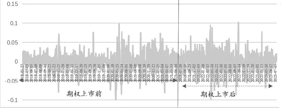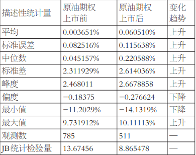 图为原油期权上市前后原油期货收益率时序(单位:%) 从收益率时序图看,原油期货收益率均在0值附近震荡。从收益率的描述性统计看出,原油期货收益率的均值、中位数、标准差均上升,均值由前期的0.0036%提高至0.0605%,中位数从0.0452%提高至0.2206%,标准差从上市前的2.31%提高至上市后的2.61%,显示出原油期权上市后,原油期货的收益率序列离散程度小幅提高,但幅度不大。