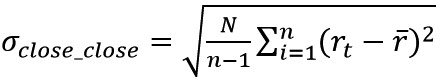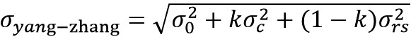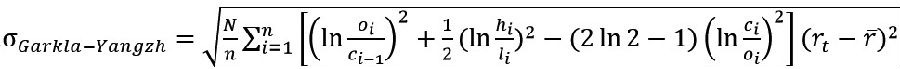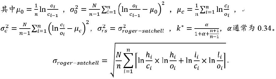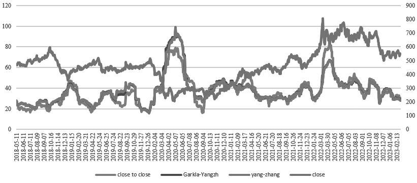 表为原油期权上市前后原油期货收益率时序 JB检验结果表明,原油期权上市前后原油期货收益率检验量均大于6,收益率序列均不服从正态分布,原油期货收益率具有有偏和厚尾的。厚尾的存在意味着原油期货发生大的价格变化的次数比当收益率服从正态分布时更为频繁。 随后对原油期权上市前后收益率的方差进行F检验,结果显示,F检验统计量为0.782215,P值为0.001033,在95%的置信水平下接受方差相等的原假设,得出原油期权上市前后原油期货收益率的波动未发生显著变化。 [原油期权波动率描述性统计] 波动率是影响期权价格变动十分重要的因素,这是因为波动率可以体现出标的价格变动的速度,并且能够衡量一段时间内标的价格的变动幅度。一些成熟国家认为交易期权就是交易波动率,对于期货及期权合约,市场常用历史波动率作出分析供交易使用。 历史波动率计算方法 历史波动率是根据标的原油期货收益率进行计算的波动率,它代表原油期权标的原油期货在过去一段时间内的波动程度。一般计算公式有:close _close volatility、Garman-Klass-Yang-Zhang Volatility(缩写为Garkla_Yangzh)和Yang-Zhang Volatility等方式。具体的公式如下: 1. 其中<Z:\KT2024\241028d1.tif>为收益率,<Z:\KT2024\241028d4.tif>为平均收益率,N是年化日期,一般时间选择252天或者260天,n是历史波动率选择周期,本文选择n=30。 2. 其中ci、oi、hi、li分别为i时刻的收盘价、开盘价、最高价和最低价。 3.