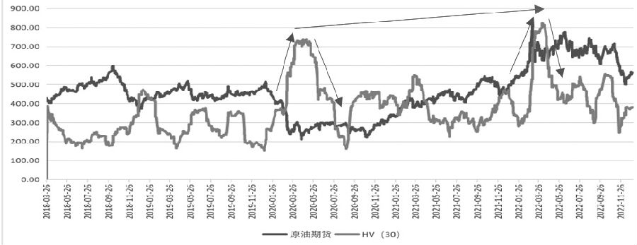图为原油期货季节性30日波动走势 整体来看,自2020年新冠疫情大规模暴发之后,三年间原油期货波动率具有颇为相似的年度走势。从年度来看,2020年一季度需求疲软,油价迅速下跌带动期货波动率在一季度末开始剧烈波动。自二季度开始,需求平稳恢复、价格平稳震荡,波动率水平从高位剧烈向下回落至三季度末。之后,疫情再度来袭,价格开始再次大幅下跌,波动率水平迅速抬升,直至年末开始窄幅震荡。2021年各地疫情情况有所好转,整体波动率水平不及2020年度。但同样在一季度及四季度寒冷季节因素导致需求疲软、价格剧烈波动,波动率宽幅震荡。2022年除疫情因素之外,俄乌冲突及美联储加息也对油价波动起到推动作用,整体波动月份稍有后延,但整体波动率走势相较前两年并无明显变化。 结合波动率季节性走势图,从单月来看,一年中3月、4月、5月和10月是波动程度最高的月份,均超过40%的水平,而1月、2月、8月、9月和11月波动程度相对较低。从季节特征来看,这三年内一季度波动率整体先震荡为主进而大幅上升,二季度开始高位回落,三季度末四季度初继续发力上涨,直到四季度下旬开始平稳震荡。从近三年情况来看,原油期货波动率具有较强的季节性特征,剧烈波动聚集在一季度末二季度初及三季度末四季度初。 [原油期权研究的启示] 自原油期货上市以来,国内原油市场上涨的主要因素来源于地缘政治溢价和OPEC组织减产预期,下跌的主要因素来源于美联储加息和宏观等因素影响。