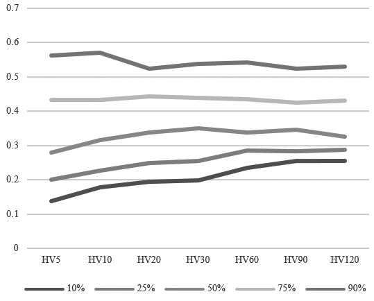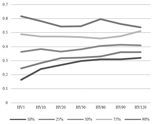 图为原油期权上市后历史波动率锥 上两张图中,横坐标表示不同期限的历史波动率(HV5表示5日的历史波动率),纵坐标表示历史波动率的大小,曲线表示不同期限的历史波动率在各个分位数上的数值。因此,从原油期权上市前和整体周期历史波动率在各个百分位的数值上看,原油期货的历史波动率具有如下特性,投资者在做波动率交易时可以参考这些特征进行判断: 1.原油期权上市前的历史波动率锥与原油期权上市后的历史波动率形状相似,但原油期权上市前的历史波动率锥收缩慢于原油期权上市后的历史波动率锥,主要是原油期权上市后,原油期权和原油期货相互提供流动性,原油期权市场存在机构投资者,善于捕捉波动率回落的行情,因此原油期权上市后原油期权中长期波动率更加稳定。 2.原油期货历史波动率中长期波动率具有中位聚集的特征,短期波动率的变化较为发散。 3.原油期货历史波动率中短期波动率波幅大于长期波动率,即短期波动率相对中长期波动率变化更为剧烈。 4.当原油期货历史波动率中短期波动率较低时,中长期波动率随周期的增长而增长。当短期波动率较高时,中长期波动率随周长的增长而减少。因此,波动率具有均值回归的特征,在给定的市场下,波动率不可能长期保持在极端水平,最终要回归一个相对稳定的均值水平。 5.原油期权上市后原油期货历史波动率锥与前期历史波动率锥相比,短期历史波动率波动范围扩大,但中长期历史波动率波动范围收窄。从形状上看,原油期权上市前短期历史波动率较中期历史波动率回复速度并不快,但是上市后,短期历史波动率较中期历史波动率明显波动收窄。 本文对原油期权上市前后原油期货的收益率进行JB检验,发现原油期货的收益率并不服从正态分布,具有有偏和厚尾的。本文对原油期权历史波动率进行统计分析发现,原油期权上市后短期历史波动率水平明显提升,长期波动率具有中位聚集、波动率发散、脉冲性和季节性等特征。综上所述,为了更好地发挥原油期权的作用,涉油企业可利用原油市场的季节性变化有步骤地安排套保计划。(作者单位:徽商期货) (责任编辑:迷你学人) |