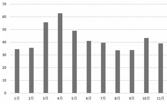 图为原油期权标的原油期货上市以来波动率走势 波动率存在季节性规律 笔者选用2020—2022年来原油期货的30日历史波动率,并通过计算其每月平均波动率来观察其季节性的波动率变化规律。
