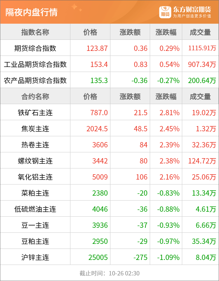隔夜行情![]() ![]() 每日精选中钢协:加快研究推进产能治理和联合重组 木材产业链“迎新”!证监会同意原木期货和期权注册! 玻璃涨价函频发?业内人士:10月之后存在涨价趋势 宏观产经国家统计局:1—9月份,全国规模以上工业企业实现利润总额52281.6亿元,同比下降3.5%。受去年同期高基数等因素影响,9月份,规模以上工业企业利润同比下降27.1%。 央视网:国务院总理李强10月25日主持召开国务院常务会议。为深入贯彻落实9月26日中央政治局会议精神,近期国务院领导同志就当前经济形势和一揽子增量政策落实情况分赴各地开展调研,会议就此进行了交流并研究了相关工作。会议强调,要紧紧围绕努力实现全年经济社会发展目标,持续抓好一揽子增量政策的落地落实,及时评估和优化政策,加大逆周期调节力度,进一步提升宏观调控成效。同时更加注重政策和市场的互动,充分调动各方面积极性,更好激发增长动能。 财政部网站:1—9月,全国一般公共预算收入163059亿元,同比下降2.2%。其中,全国税收收入131715亿元,同比下降5.3%;非税收入31344亿元,同比增长13.5%。分中央和地方看,中央一般公共预算收入71710亿元,同比下降5.5%;地方一般公共预算本级收入91349亿元,同比增长0.6%。 品种资讯黑色系期货 钢材:据不完全统计,25日约有11家钢厂调整建材出厂价格,螺纹钢价格最高下调50元/吨。(西本新干线) 10月25日,76家独立电弧炉建筑钢材钢厂平均成本为3510元/吨,日环比减少7元/吨。平均利润为63元/吨,谷电利润为172元/吨。(Mysteel) 锰硅:截至10月24日当周,全国63家独立硅锰企业样本库存量为204000吨,环比增长18500吨。其中宁夏产区库存增量最为显著,环比增长15000吨至87000吨,其余各产区库存则多有小幅上涨。(Mysteel) 铁矿石:全国45个港口进口铁矿石库存总量15341.68万吨,环比增44.15万吨,45港日均疏港量323.34万吨,环比降2.56万吨。 全国钢厂进口铁矿石库存总量为8978.91万吨,环比减少27.82 万吨;当前样本钢厂的进口矿日耗为290.84万吨,环比增加1.92万吨,库存消费比30.87,环比减少0.30天。(Mysteel) 煤炭:截至10月25日当周,统计独立焦企全样本产能利用率为73.96%,减0.28%;焦炭日均产量66.87万吨,减0.26万吨;焦炭库存77.89万吨,增5.78万吨;炼焦煤总库存923.29万吨,减34.17万吨;焦煤可用天数10.4天,减0.34天。(Mysteel) 农产品期货 棕榈油:据船运调查机构ITS数据显示,马来西亚10月1-25日棕榈油出口量为1322325吨,较上月同期出口的1193471吨增加10.8%。 据马来西亚独立检验机构AmSpec,马来西亚10月1-25日棕榈油出口量为1260033吨,较上月同期出口的1148592吨增加9.7%。(新华财经) 生猪:截至10月25日14:00时,全国农产品批发市场猪肉平均价格为24.67元/公斤,比昨天下降0.6%。(农业农村部) 有色/贵金属期货 碳酸锂:上海钢联发布数据显示,10月25日电池级碳酸锂价格较上日上涨1000元,均价报7.25万元/吨。(财联社) 沪镍:10月25日,全国港口镍矿库存较10月18日继续累库20万湿吨至1058.2万湿吨。总折合金属量8.307万金属吨。(上海有色网) 氧化铝:截至10/24,全国氧化铝产能利用率为87.02%,较上周下降1个百分点,氧化铝产能利用率下降。主因是受各地区重污染天气预警影响,北方部分氧化铝厂被迫停炉压产,短期产量有所缩减。(Mysteel) 能化期货 原油:高盛集团分析师Daan Struyven等在报告中表示,在中国近期出台一揽子刺激计划后,经济增长前景改善,可能会给石油需求带来10万桶/日的提振,到2025年末将油价推高1-2美元/桶。(财联社) 纯碱:远兴能源10月25日在投资者互动平台表示,阿拉善天然碱项目所有生产线均正常运行,近期没有停产检修计划;阿拉善天然碱项目第四条生产线已具备达产条件;阿拉善天然碱项目第三、第四条生产线共用设备故障消除工作正按计划推进,目前通过采取相关技术措施,已降低设备故障对生产负荷的影响。(每日经济新闻) 尿素:25日尿素行情大稳小动,部分地区调整幅度10-20元/吨左右。(农时达情报) 其他期货 欧线集运:截至10月25日,上海出口集装箱运价综合指数报2185.33点,与上期相比涨123.18点;中国出口集装箱运价综合指数报1366.40点,与上期相比跌2.8%。(上海航运交易所) 环球视野财联社:俄罗斯央行加息200个基点,将基金利率从19%上调至21%,市场预期加息至20%。 央视新闻:记者当地时间26日获悉,以色列26日凌晨对伊朗发动的军事打击行动已导致伊朗4名军事人员死亡。 每日关注无 (文章来源:东方财富研究中心) (责任编辑:迷你学人) |
