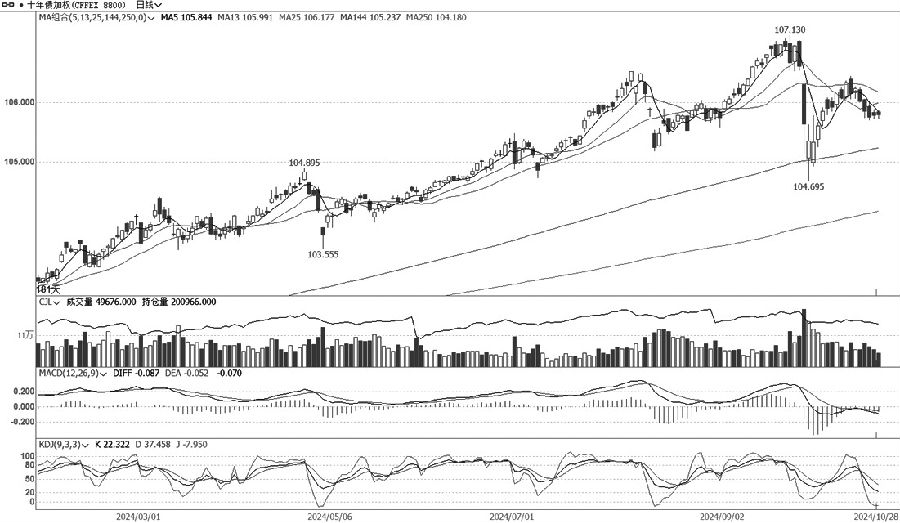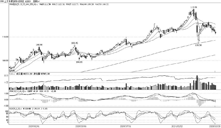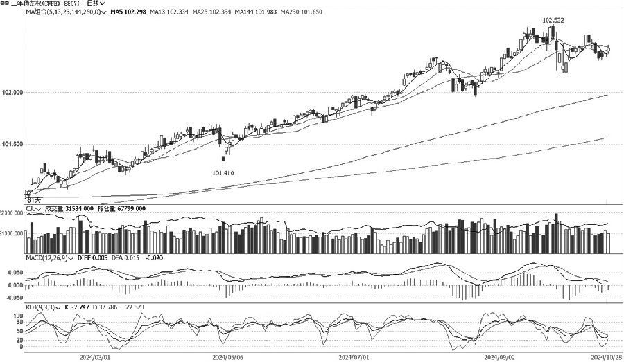 TS加权维持震荡走势,波动幅度收窄,量仓等指标分化明显。周一早盘高开高走,盘中延续震荡偏强走势,以小阳线报收。TS主连合约加仓较多,远月合约亦不同程度加仓。TS加权MACD指标绿柱收窄,KDJ快线从低位开始回升,总体呈现蓄势回升状态。量仓支持度逐渐提升,短期震荡为主,建议多单持有。 T 观望为主