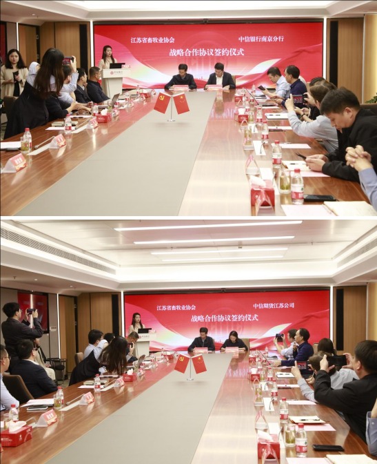 朱满兴秘书长在致辞中表示,本次活动的初衷和主题是集思广益,共同分析猪市与探讨应对之策。江苏省畜牧业协会自2023年起与中信期货江苏分公司建立了战略合作伙伴关系,这次活动也是一次发挥各自优势,聚焦生猪产业,深化合作、不断提升各自服务水平的具体行动。江苏省畜牧业协会将进一步与中信银行南京分行、中信期货江苏分公司深化合作,携手并进,为协会旗下的会员企业提供更好的服务。 本次沙龙活动上,江苏省畜牧业协会分别与中信银行南京分行、中信期货江苏分公司签署了战略合作协议。三方旨在通过本次协议的签订,进一步扩大合作交流,优势互补,形成合力,为促进江苏省畜牧业技术创新、市场开拓、高质量发展等提供帮助与支持。