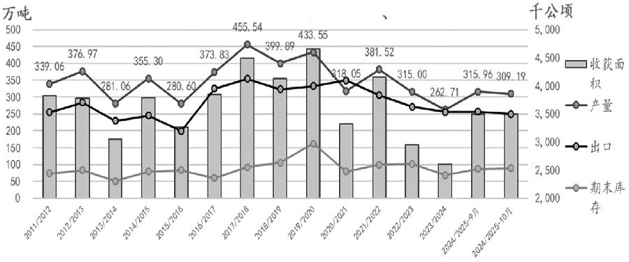 近期棉花的供需矛盾并不突出。供给端,新棉成本基本确定,对棉价形成一定支撑,叠加目前处于新棉上市阶段,新棉抛售压力不大;需求端,进入淡季之后,需求有走弱的风险。目前下游棉纱库存处于中等水平,对棉花采购仍以刚需为主,后续的需求表现及春节前能否出现小旺季,是中期行情的关键。 美国农业部10月份的供需报告将美棉2024/2025年度产量下调6.8万吨至309.2万吨,较2023/2024年度增加46.5万吨;美国农业部将美棉产量连续三个月进行了下调,美棉产量大幅低于此前预期。目前美棉收获进度偏快,截至10月27日,美棉15个棉花主要种植州收割率为52%,较去年同期快5个百分点,比近五年同期平均水平高6个百分点。