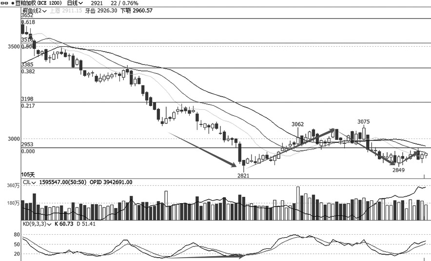 从原油加权日线走势图看,原油见底490.3元/桶后展开反弹,最高冲至576.5元/桶,走出一个完整的5浪行情,随后展开回落,A—B—C结构清晰,目前正处于C浪过程中。由于A浪走势已经弥补了缺口,说明走势已经趋弱,所以B浪反弹很浅,周一大幅走低有效跌破A浪低点,进而展开了C浪走势,周二更是以跳空缺口形式开盘,佐证了C浪的运行。如果后市价格跌破507.9元/桶的话,将冲击前期低点490.3元/桶一线。 豆粕 等待双底