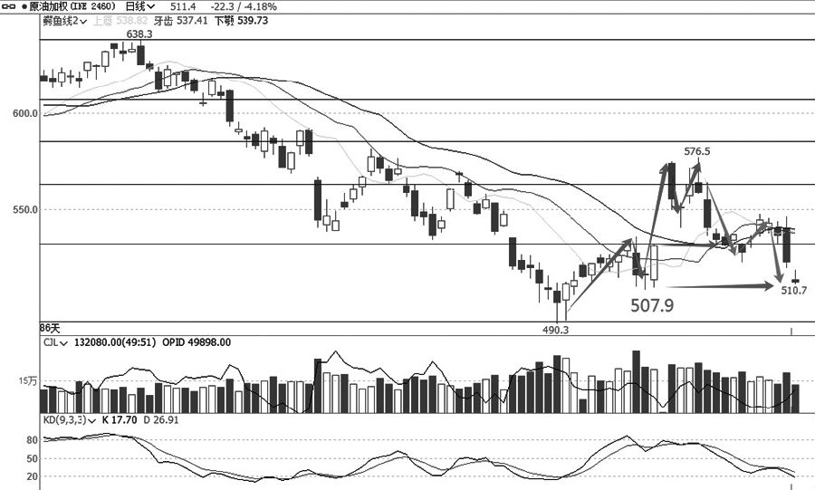 从集运(欧线)加权日线走势图看,该品种经历了一轮大幅的单边下跌趋势,于9月初见底1498.7后,一路震荡走高,最高冲至2622.6,均线系统由空头排列转向多头排列,昨日跳空低开震荡走高,并未跌破前期调整低点,依然处于反弹趋势中。但是值得注意的是,反弹高点低于下跌幅度0.382的位置,KD指标也形成了看跌反转信号,由此判断目前的反弹是一个弱势反弹,价格若不能再创新高,则有可能回落。 原油 C浪下跌