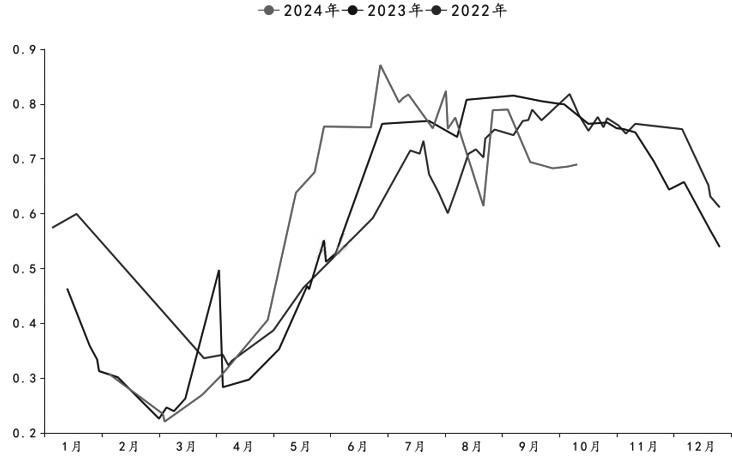 图为巴西中南部甘蔗单产(单位:吨/公顷) 制糖比方面,截至10月上半月,巴西中南部地区的甘蔗累计制糖比例为48.74%,同比减少0.71个百分点。虽然制糖比例依然处于高位,但是同比有所下降,超出了榨季前市场的预期。除了甘蔗品质下降导致糖厂降低制糖比例外,我们认为很重要的一点是今年巴西国内乙醇消费量明显增加,使得糖厂更愿意生产乙醇。2024/2025榨季截至10月上半月,巴西中南部地区累计销售乙醇193亿升,同比增加16.29%。其中含水乙醇销量为125.1亿升,同比增加29.08%;无水乙醇销量为67.9亿升,同比增加1.66%。乙醇销量增加的主要原因是醇油比价偏低,消费者使用乙醇更经济。另外,今年含水乙醇在巴西汽车燃料市场中的使用份额也持续回升,显示乙醇市场开始复苏。 从最新的数据来看,减产的影响仍未体现在数据中。2024/2025榨季截至10月上半月,巴西中南部地区共压榨甘蔗53884万吨,同比增加2.35%;产糖量为3559万吨,同比增加1.93%。巴西生产进度较快也对盘面形成了压力,近期美糖出现了一定的回调。不过,我们认为巴西减产大局已定。从单产来看,截至9月底的累计甘蔗单产已经同比下降9.21%,只不过由于压榨进度较快,减产还没有反映在数据上。 [跟踪四季度至明年一季度巴西降雨情况] 值得注意的是,巴西减产题材已经交易了一段时间,利多在价格中已经有所反映。另外,2023/2024榨季巴西中南部地区的甘蔗单产较高,即使在最新的单产下降幅度预估下,产糖量仍旧维持高位。 2023/2024榨季巴西中南部地区的甘蔗单产为87.2吨/公顷,即使2024/2025榨季中南部地区甘蔗单产同比下降9%,单产依旧能达到79吨/公顷,在历史上处于较高水平。因此,2024/2025榨季巴西中南部地区的产糖量仍将在3850万~3900万吨。虽然同比明显下降,但是总量依然较高。因此,美糖缺乏新的利多驱动。后期需要重点关注的是四季度至明年一季度的降雨情况,如果干旱持续到明年一季度,2025/2026榨季巴西甘蔗单产将进一步下降,巴西糖的产量将出现明显下降。从欧洲气象中心的长期预报来看,11月和12月,巴西中南部地区的降雨量同比依然较低,明年一季度降雨量较均值有所回升,但是增幅并不大。因此,后期巴西甘蔗主产区可能会继续干旱,关注后期降雨情况。 [2024/2025榨季印度、泰国增产预期较强] 巴西生产已经进入尾声,市场的关注点转向2024/2025榨季北半球的食糖产量。泰国方面,去年厄尔尼诺现象使得泰国产区发生干旱,2023/2024榨季泰国食糖产量同比下降了20%。今年雨季泰国降雨充沛,美国农业部预计泰国食糖产量同比增加13%至1020万吨。美国农业部的报告显示,今年前三季度泰国东北和中东部地区降雨量同比增加15%,有利于甘蔗的生长。由于产量预期增加,2024/2025榨季泰国的食糖出口预期也有所增加。 印度方面,今年雨季降雨情况较好,特别是马邦降雨充沛,有利于甘蔗的生长。从遥感数据来看,今年印度大部分甘蔗产区的植被指数同比增加,显示甘蔗长势好于去年。美国农业部预计2024/2025榨季印度食糖产量为3320万吨,同比增加3.75%。乙醇方面,印度去年达到了12%的乙醇掺兑目标,美国农业部预计2024/2025榨季印度乙醇的掺兑比例在11.5%左右,乙醇产量为63.5亿升,同比小幅下降1%。出口方面,目前仍然没有消息称印度会在新榨季放开食糖出口限制。另外,印度食糖产量变化幅度也不大,食糖出口的可能性不大,关注后续政策变化。