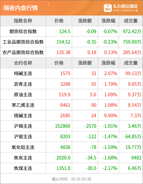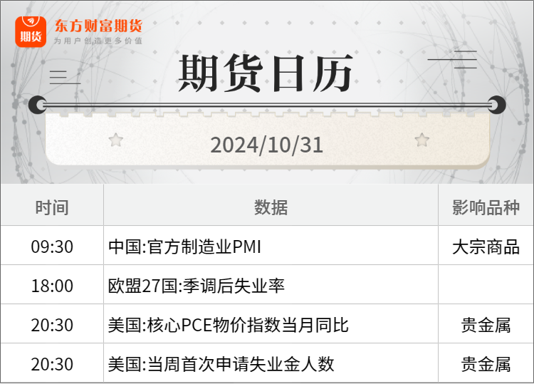 隔夜行情![]() ![]() 每日精选美国10月ADP就业人数增加23.3万人 大超预期 交易所出手降温 氧化铝“疯牛”到何时? 突然拉升!金价再创历史新高 高盛预计金价明年将涨到3000美元 宏观产经国家发改委:六部门发布关于大力实施可再生能源替代行动的指导意见。其中在总体要求中提到,“十四五”重点领域可再生能源替代取得积极进展,2025年全国可再生能源消费量达到11亿吨标煤以上。“十五五”各领域优先利用可再生能源的生产生活方式基本形成,2030年全国可再生能源消费量达到15亿吨标煤以上,有力支撑实现2030年碳达峰目标。 商务部:美财政部发布对华投资限制最终规则。对此,商务部新闻发言人表示,中方坚决反对美方出台对华投资限制最终规则,已向美方提出严正交涉,并保留采取措施的权利。 每日经济新闻:欧盟委员会发布消息称结束了反补贴调查,决定对从中国进口的电动汽车(BEV)征收为期五年的最终反补贴税。据悉,将对被抽样的中国出口生产商将征收以下反补贴税,比亚迪17.0%;吉利18.8%;上汽集团35.3%;其他合作公司将被征收20.7%的关税。 品种资讯黑色系期货 钢材:中钢协日前在北京召开三季度部分钢铁企业经济运行座谈会。就如何迎接当前严峻的行业形势,鞍钢集团表示,将统筹各具特色的11个钢铁生产基地,充分释放研发、生产、销售、加工配送和物流等方面协同效应,打造优质高效的营销服务体系。(财联社) 铁矿石:据上海钢联(Mysteel),10月30日,全国主港铁矿累计成交133.2万吨,环比上涨20.93%;本月平均每日成交96.3万吨,环比下跌5.22%。当天远期现货累计成交88.0万吨(7笔),环比下跌34.33%,其中矿山成交量为28万吨。(Mysteel) 焦煤:10月30日海运炼焦煤港口现货偏弱运行。焦炭第二轮提降仍在博弈,下游采购为规避风险,采购节奏放缓,整体成交下滑10-20元/吨。现俄罗斯K4主焦煤1280元/吨;GJ1/3焦煤1260元/吨;Elga肥煤1270元/吨降10元/吨;伊娜琳肥煤1280元/吨;K10瘦煤1350元/吨;GZH1/3焦煤1230元/吨;百丽气肥煤1100元/吨,以上均为港口现金含税自提价。(Mysteel) 农产品期货 苹果:山东产区苹果交易活跃度提高,栖霞地区80#以上一二级片红货源主流价格3.0-3.2元/斤,条纹货主流价格3.5-3.8元/斤,个别高价4.0元/斤。果农顺价出货意愿比较强,自行存储的意愿不高,客商采购比较积极,近期成交良好。(卓创资讯) 豆粕:据上海钢联(Mysteel)农产品团队统计,10月30日全国主要油厂豆粕成交33.99万吨,较前一日增加7.17万吨,其中现货成交29.99万吨,远月基差成交4万吨。当日全国动态全样本油厂开机率下降至54.13%,前一日为57.64%。(Mysteel) 淀粉:据上海钢联(Mysteel)农产品调查,截至10月30日当周,全国玉米淀粉企业淀粉库存总量82.4万吨,较上周增加2.90万吨,周增幅3.65%,月降幅10.07%,年同比增幅34.20%。 据Mysteel农产品调查数据显示,本周(10月24日-10月30日)全国玉米加工总量为66.22万吨,较上周增加3.61万吨;周度全国玉米淀粉产量为33.53万吨,较上周产量增加2.42万吨;周度开机率为64.82%,较上周升高4.68%。(Mysteel) 有色/贵金属期货 黄金:世界黄金协会30日发布的2024年三季度《全球黄金需求趋势报告》显示,2024年三季度全球黄金需求总量为1313吨,同比增长5%。由于三季度金价连创历史新高,按美元计价的黄金需求总额首次突破1000亿美元,同比增长35%,刷新历史纪录。(央视新闻) 碳酸锂:澳大利亚锂矿开采商皮尔巴拉矿业公司在10月30日提交的文件中表示,将暂停其位于西澳大利亚皮尔冈戈拉项目的Ngungaju加工厂的产出,因为价格下滑挤压了该行业。(界面新闻) 据上海钢联消息,10月30日电池级碳酸锂中间价较前一日下跌500元/吨,报73000元/吨。(财联社) 工业硅:10月30日,中国有色金属工业协会硅业分会发文称,本周工业硅现货价格部分地区及牌号价格小幅探涨,整体持稳。过去一周(2024年10月24日-30日),主力合约2412收盘价从12865元/吨先涨后跌至12800元/吨,整体跌幅为0.51%。(界面新闻) 能化期货 沥青:最新数据显示,截至10月30日当周,中国沥青炼厂产能利用率达到29.4%,环比增加0.7个百分点,沥青周产量为50.6万吨,环比增加2.6个百分点。尽管齐鲁石化、东明石化和云南石化间歇转产渣油,损失产能共计400万吨/年,但克石化的增产,以及中化泉州和北海炼化的间歇性生产,共同推动整体产能利用率上升。(隆众资讯) 燃油:据新加坡企业发展局(ESG),截至10月29日当周,新加坡燃料油库存下降479.1万桶,至6年低点1535.4万桶。(新华财经) 甲醇:中国甲醇港口库存总量在118.38万吨,较上一期数据增加7.51万吨。其中,华东地区累库,库存增加6.97万吨;华南地区窄幅累库,库存增加0.54万吨。本周甲醇港口库存继续累库,卸货情况正常,外轮在统计周期内27.46万吨,江苏主流社会库提货略有提升,有终端提货表现在非显性库区,个别在卸船货尚未计入在内。(隆众资讯) 环球视野第一财经:据CME“美联储观察”:美联储到11月降25个基点的概率为99%,维持当前利率不变的概率为1%。到12月维持当前利率不变的概率为0.5%,累计降息25个基点的概率为22.9%,累计降息50个基点的概率为76.6%。 财联社:美国第三季度实际GDP年化季率初值为2.8%,预期3%,前值3%。 每日关注![]()