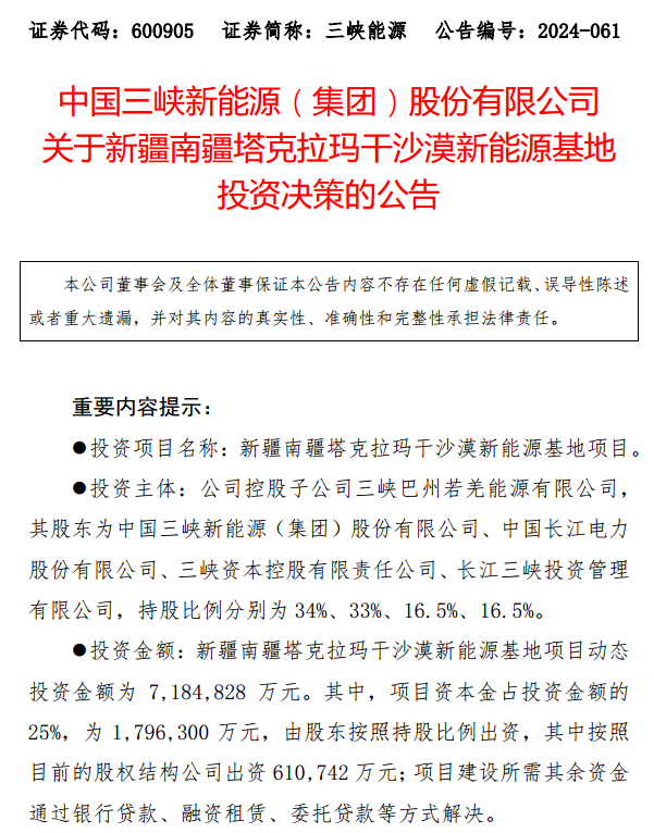 10月30日晚间,三峡能源公告称,公司与长江电力等公司拟通过子公司参与投建新疆南疆塔克拉玛干沙漠新能源基地项目(以下简称南疆基地项目),包含建设光伏850万千瓦、风电400万千瓦等,合计动态投资达718.48亿元。 同日晚间,国家发展改革委等六部门发布《关于大力实施可再生能源替代行动的指导意见》提到“加快推进以沙漠、戈壁、荒漠地区为重点的大型风电光伏基地建设”。 南疆地区首个“沙戈荒”大基地项目 三峡能源公告称,南疆基地项目是南疆地区第一个“沙戈荒”大基地项目。公司拟参与投建该项目是落实国家区域发展战略,加快规划建设新型能源体系的重要举措,落实产业兴疆政策的具体实践。 南疆基地项目为“风光火储”一体化外送项目,计划在新疆巴州若羌县塔克拉玛干沙漠东南缘规划建设光伏850万千瓦、风电400万千瓦,配套建设煤电6×66万千瓦和新型储能500万千瓦时,所发电力拟依托已纳入规划的疆电(南疆)送电川渝特高压直流工程外送消纳。 南疆基地项目建成后,预计每年可向川渝地区送电约360亿千瓦时,从而进一步缓解我国资源禀赋与用电负荷存在地理分布不均衡的矛盾,促进区域协调发展。 《关于大力实施可再生能源替代行动的指导意见》指出,加快推进以沙漠、戈壁、荒漠地区为重点的大型风电光伏基地建设;推进光伏治沙、光伏廊道和海洋牧场等深层次立体化发展,形成深度融合、持续替代的创新替代发展局面。 ![]() 三峡集团公告称,建设以沙漠、戈壁、荒漠地区为重点的大型风光基地,是贯彻落实国家区域发展战略、加快规划建设新型能源体系、提高安全保障能力的重要举措。 而南疆基地项目的开发,将有力推动“沙戈荒”地区高比例、大规模新能源开发创新示范,对加快建设新型电力系统具有示范意义。 三峡集团公告称,预计南疆基地项目的整体工程建设期为3至4年,其中新能源与储能项目建设将根据煤电项目、外送通道建设进度适时调整,保障“三位一体”(新能源、支撑性煤电、输电通道)同步建成。 多家电力央企参与投建 南疆基地项目的动态投资达718.48亿元,项目资本金按照动态投资的25%核定为179.63亿元,由投资主体按照目前的股权结构出资,其余资金通过银行贷款、融资租赁、委托贷款等方式解决。 南疆基地项目的投资主体为三峡巴州若羌能源有限公司(以下简称若羌公司),股东包含三峡能源、长江电力、三峡资本控股有限责任公司、长江三峡投资管理有限公司,持股比例分别为34%、33%、16.5%、16.5%。 ![]() 按照若羌公司的股权结构,三峡能源、长江电力、三峡资本控股有限责任公司、长江三峡投资管理有限公司分别需要出资61.07亿元、59.28亿元、26.94亿元、26.94亿元。 10月30日晚间,三峡能源、长江电力均发布了2024年三季报。具体来看,2024年前三季度,三峡能源、长江电力的营业收入分别同比增长12.81%、14.65%。 三峡能源以风能、太阳能的开发、投资和运营为主业,正加快推进以沙漠、戈壁、荒漠为重点的大型风电、光伏发电基地建设。2024年前三季度,公司新项目投产发电,发电量较上年同期增加。 长江电力以大型水电运营为主业,是全球最大的水电上市公司。2024年前三季度,公司六座梯级电站总发电量同比增加。 截至10月30日收盘,三峡能源、长江电力的总市值分别为1317亿元、6780亿元。 ![]() ![]() (文章来源:中国基金报) (责任编辑:迷你学人) |