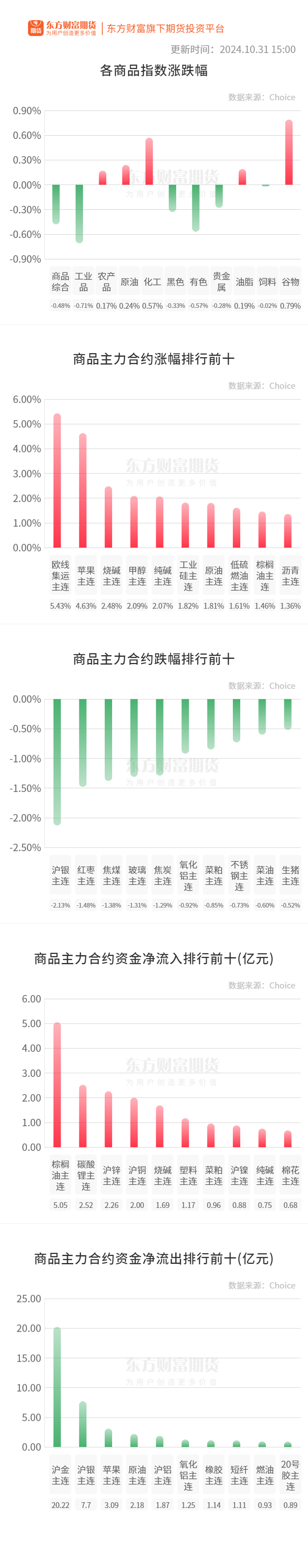行情纵览![]() 宏观产经国家统计局:10月份,制造业采购经理指数(PMI)为50.1%,比上月上升0.3个百分点,制造业景气水平回升。从企业规模看,大、中型企业PMI分别为51.5%和49.4%,比上月上升0.9和0.2个百分点;小型企业PMI为47.5%,比上月下降1.0个百分点。 财联社:央行今日进行3276亿元7天期逆回购操作,中标利率为1.50%,与此前持平。 品种资讯黑色系期货 螺纹钢:据Mysteel,截至10月31日当周,螺纹钢产量、厂库由增转降,社库由降转增,表需连续第二周下降。螺纹产量243.22万吨,较上周减少7.93万吨,降幅3.16%。(Mysteel) 当前钢市基本面偏弱格局未改,供给增加而需求平淡,加之近日超强台风来袭,华东沿海及海南等地持续降雨,延缓钢市成交。短期来看,强预期与弱现实继续博弈,钢价或延续窄幅调整运行。(Mysteel) 热卷:据上海有色网(SMM),截至10月31日当周,全国86仓库(大样本)热卷社会库370.76万吨,环比下降16.67万吨,降幅4.3%。(SMM) 农产品期货 棕榈油:据船运调查机构ITS数据显示,马来西亚10月1-31日棕榈油出口量为1624210吨,较上月同期出口的1457408吨增加11.4%。(新华财经) 苹果:“苹果期货的上涨更多还是来源于市场对于山东货质量下滑的影响的担忧,现货价格最近半个月也出现了一定的上涨,山东栖霞80#一二级均价从月中的3元/斤上涨至3.5元/斤,洛川70#以上半商品的均价从3元/斤上涨至3.15元/斤。从远月期货价格的角度考虑,期现价格上涨几乎是同步的,这是由于远月的定价逻辑是基于山东货价格影响的。”农产品分析师边舒扬接受记者采访时表示。(华夏时报) 生猪:据农业农村部监测,10月31日“农产品批发价格200指数”为126.48,比昨天下降0.12个点,“菜篮子”产品批发价格指数为128.48,比昨天下降0.14个点。截至今日14:00,全国农产品批发市场猪肉平均价格为24.63元/公斤,比昨天下降0.4%。(证券时报网) 有色/贵金属期货 沪铜:截至10月31日周四,全国主流地区铜库存较周一微降0.03万吨至20.98万吨,连续两周周度去库。相比周一库存的变化,全国各地区的库存绝大多数是减少的,仅上海和天津的库存增加。总库存较去年同期的6.37万吨高14.61万吨。(SMM) 碳酸锂:上海钢联发布数据显示,10月31日电池级碳酸锂价格与前一日持平,均价报7.30万元/吨。(新华财经) 能化期货 PTA:外围不稳定因素较多,终端采购积极性不佳,本周PTA现货价格持续走弱,但原料端PX表现相对坚挺,令加工区间环比持续走弱。截止2024年10月30日,中国PTA平均加工区间:337.76元/吨,环比-4.65%,同比-4.70%。(隆众资讯) 乙二醇:截至10月31日,华东主港地区MEG港口库存总量58.28万吨,较上一统计周期减少2.09万吨。本周港口提货尚可,卸货平平,库存小幅回落,今日受台风影响部分码头开始封航。码头发货方面:周内张家港日均发货7500吨;太仓两库综合日均发货4500吨;宁波主港日均发货3800吨。(隆众资讯) 玻璃:玻璃企业继续去库,厂家库存偏低,截止到10月31日,全国浮法玻璃样本企业总库存5105.8万重箱,环比下降588.3万重箱或10.33%,创2月中旬以来新低,同比增加23.72%,折库存天数23.8天,较上期下降2.3天,不过期现商库存偏高。(隆众资讯) 晚间关注20:30 美国:当周首次申请失业金人数 20:30 美国:核心PCE物价指数当月同比 (文章来源:东方财富研究中心) (责任编辑:迷你学人) |