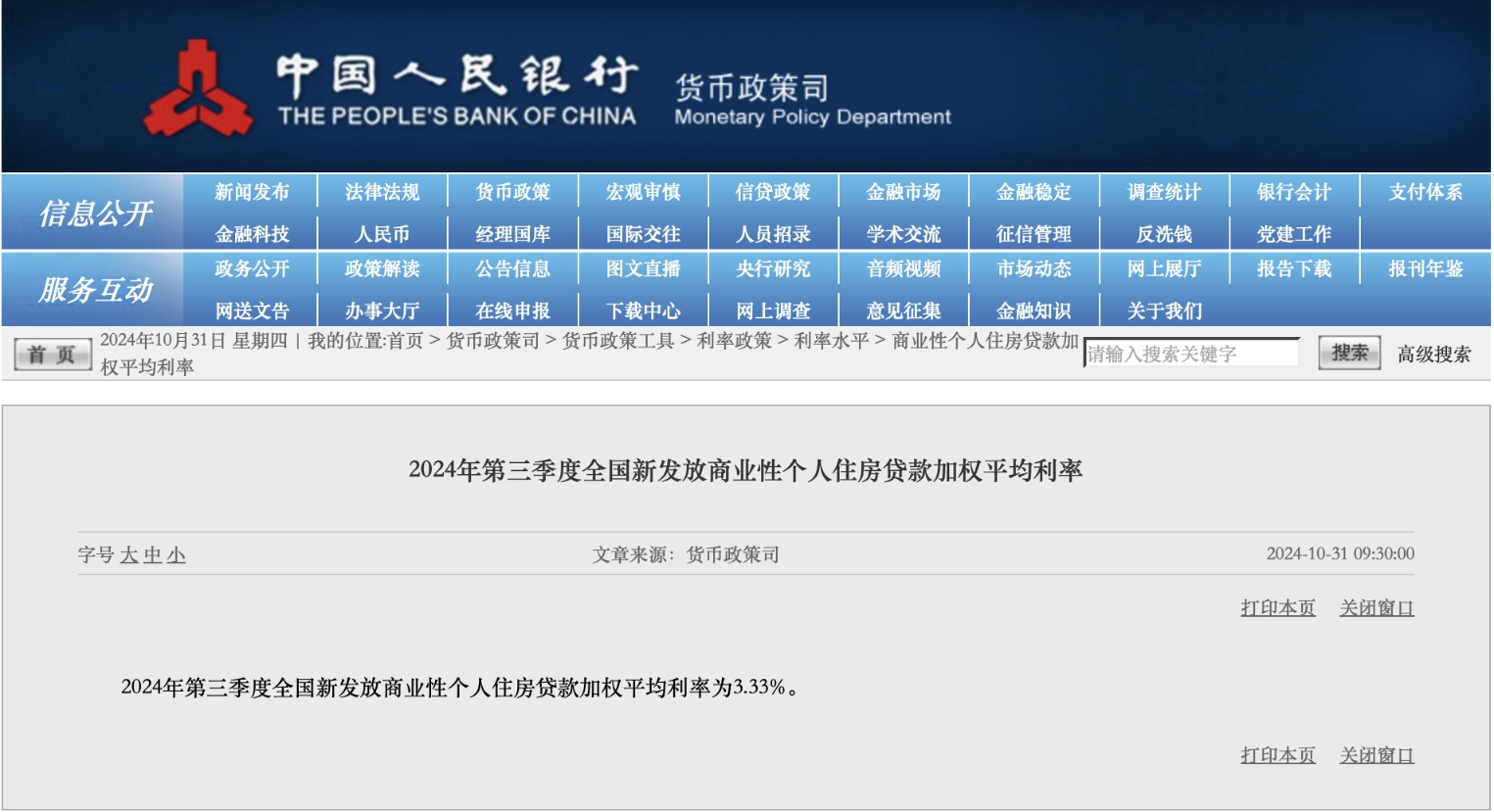 完善商业性个人住房贷款利率定价新机制今日落地。 新机制与房贷利率加点幅度动态调整相关。10月31日,工行、农行、中行、建行、交行、邮储6家国有大行陆续发布关于完善存量个人住房贷款利率定价机制的公告,自2024年11月1日起,符合条件的存量房贷借款人在与商业银行协商调整房贷利率加点幅度的同时,也可调整重定价周期。 梳理各家银行公告来看,自2024年11月1日(含当日)起,各银行开始受理客户申请调整存量房贷利率加点值和重定价周期。其中,申请调整利率加点值没有次数限制,符合下调条件您即可申请调整;但在同一笔贷款存续周期内,贷款人仅可申请调整1次重定价周期,可选择3个月、6个月或12个月作为重定价周期。重定价周期调整完成后将不可撤销。 实际上,中国人民银行在一个月前就发布了完善商业性个人住房贷款利率定价机制要求。不过,由于房贷政策与老百姓息息相关,在各家银行公告落地后,对于具体的实施细则依然引起市场的广泛关注。 目前,市场关注焦点主要集中在:如何判断我的存量房贷利率加点值能否调整?全国新发放房贷利率平均加点值该如何确定?北、上、深房贷客户如何操作?申请调整利率加点值、重定价周期有次数限制吗? 对此,第一财经记者采访监管部门人士、市场权威专家,并结合各银行公告梳理如下: 利率加点值调整有触发条件 中国人民银行公告〔2024〕第11号提出,存量房贷利率与全国新发放房贷利率偏离达到一定幅度时,借款人可与银行自主协商、动态调整存量房贷利率。 首先需要明确的是,利率加点值调整的触发条件是:如客户的房贷LPR加点值高于全国新发放房贷利率平均加点值加30BP的,客户可向银行申请调整LPR加点值。如不高于,则无法调整。 其中,全国新发放房贷利率平均加点值=人行最新公布的全国新发放房贷平均利率-该利率对应季度内各月公布的5年期以上LPR的算术平均值。 贷款人可以将贷款的LPR加点值与全国新发放房贷利率平均加点值+30BP进行比较,如果贷款的LPR加点值高,则可申请将贷款加点值下调至全国新发放房贷利率平均加点值+30BP。 举例来看,客户的贷款利率为LPR-20BP,最新公布的全国新发放房贷利率为3.33%,考虑到对应季度(即7-9月)公布的5年期以上LPR平均为3.85%,则全国新发放房贷利率平均加点值为-52BP(3.33%-3.85%)。全国新发放房贷利率平均加点值+30BP为-22BP(-52BP+30BP),由于客户的贷款加点值为-20BP,高于-22BP,则可申请下调至-22BP,下调后的贷款利率为LPR-22BP。 将该偏离幅度约定为30BP是为兼顾合理让利与可持续性经营,商业银行经过测算得出的结论。 接近央行人士对记者表示,偏离幅度如果设定过大,借款人心理有落差,可能增加提前还贷,不利于建立存量房贷利率渐进有序调整的长效机制。偏离幅度如果设定过小,可能造成频繁重置合同,超出银行业务承受能力,借款人也难以及时享受到优惠。 市场分析认为,考虑到10月25日绝大多数借款人的加点幅度已经批量调整至-30BP,预计2024年第四季度绝大多数借款人无须调整加点幅度。 央行按季披露全国新发放房贷利率水平 第一财经记者关注到,央行官网增设新栏目“商业性个人住房贷款加权平均利率”。 10月31日,该栏目公布,2024年第三季度全国新发放商业性个人住房贷款加权平均利率为3.33%。 ![]() 第一财经获悉,每年1月、4月、7月、10月末,中国人民银行会公布上一季度全国新发放房贷利率水平,供银行和借款人参考。 后续,购房者可以中国人民银行最新发布的全国新发放房贷平均利率所对应的加点幅度加30BP为门槛值,若存量房贷的加点幅度高于门槛值,则可与银行协商调整为门槛值。对应的加点幅度为中国人民银行最新发布的全国新发放房贷利率减去对应季度5年期以上LPR均值。 市场权威专家分析,如果新发放房贷利率加点幅度进一步下降,存量房贷利率也会跟随下行,银行会综合考虑吸储和经营成本等因素合理确定新发放房贷利率。本轮批量调整后,存量房贷利率降至3.3%,如果存量房贷与新发放房贷差异大于30BP,将推动新一轮存量房贷利率下调。因此,预计银行会较少发放利率低于3%的房贷,新发放房贷与存量房贷的利差也将保持总体稳定。 东方金诚首席宏观分析师王青则认为,往后看,综合考虑楼市走向,特别是当前计入物价因素后的实际居民房贷利率还处在偏高水平,2025年新发放房贷利率还有一定下调空间。 两个下限看孰高值 根据各家银行公告来看,客户的房贷LPR加点值调整需要满足两个条件,一是为不低于全国新发放房贷平均加点值加30BP,且不低于所在城市房贷利率加点政策下限(如有)。 这也让很多北京、上海、深圳二套房贷款客户产生疑问,自己的房贷利率常态化调整是调整到当地下限还是全国下限? 如客户所在城市有房贷利率政策下限,则调整后的利率加点值取常态化调整目标值(即全国新发放房贷利率加点值+30BP)与当地利率政策下限孰高值。如当地政策下限高于常态化调整目标值,则调整后的房贷加点值仍不能低于当地房贷利率政策下限。 例如,一位北京购房者五环内二套房利率政策下限为-5BP,高于常态化调整目标值(全国新发放房贷利率加点值+30BP,即-22BP),则该购房者调整后五环内的二套房贷款利率加点值为-5BP;如北京五环外的二套房利率政策下限为-25BP,低于常态化调整目标值(-22BP),则调整后五环外的二套房贷款利率加点
