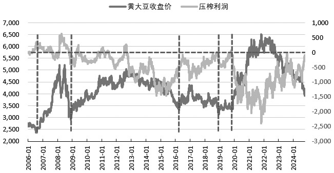 图为黄大豆1号与黄大豆2号主力合约收盘价及价差(单位:元/吨) 截至10月30日,哈尔滨地区蛋白含量39%、水分13%、过5mm筛的大豆价格为1.93元/斤,折合3860元/吨,而在国庆节前还在2元/斤以上。随着国产大豆上市,现货加速下跌。哈尔滨地区是交割基准地,上述规格的大豆略高于交割标准。截至10月30日,A2411合约收盘价3949元/吨,A2501合约收盘价3989元/吨,现货贴水盘面100元/吨以上。此外,最近黄大豆1号注册仓单增加。 国产大豆需求下降 国产大豆主要用于食品加工,少部分用于油料压榨。近年来,饮食习惯改变等因素导致大豆制品需求减少。根据终端反馈,由于销售价格和数量下降,一些大豆制品加工厂开工率较低。 从2006年开始,黄大豆1号主力合约收盘价多数要高于黄大豆2号(进口大豆),两者的平均价差在300元/吨。截至10月30日,两者价差为258元/吨,略低于平均水平。在今年食用加工需求下降的背景下,国产大豆只能降价寻找需求。 如果黄大豆1号与黄大豆2号价差远高于平均水平,那么就会出现转基因大豆流入到原先使用国产大豆的领域,也就存在替代空间。据了解,近年来,国产大豆食用加工年消费量在1400万~1500万吨,但是在国内鼓励种植大豆和油菜籽等油料作物的背景下,大豆种植面积和产量增幅较大,食用消费有些跟不上供应,这是跌价的主因之一。 国产大豆需求下降,产量远低于进口大豆,而国内对进口大豆依赖度较高,国产大豆的油用压榨价值又比不过进口大豆,国产大豆的定价不仅由自身供需决定,更会受到全球大豆供需影响。因此,即使国产大豆出现减产,但是全球大豆丰产,如果没有国内政策端支持,国产大豆价格反弹也是阶段性的,中长期还是由全球大豆的牛熊所决定,国内的减产只会在黄大豆1号与黄大豆2号价差上有所体现。 如果黄大豆1号与黄大豆2号价差在平均水平以下,甚至出现倒挂,会存在国产大豆流入油厂压榨的情形,此时国产大豆盘面压榨处于盈亏平衡线或盈亏平衡线以上。目前东北地区低蛋白毛粮大豆价格在1.7元/斤,但是出油率在17%,进口大豆通常在19%~20%。国产大豆蛋白含量在35%~36%,进口大豆在38%~39%。此外,国产大豆运输到沿海油厂还有100~300元/吨的费用,最终实际到厂价格和最终收益相比进口大豆并没有较大的优势。据了解,往年国产大豆流入油厂的压榨量在100万吨左右,相比产量还是有些不足。因此,食用加工需求转向油用压榨需求有些困难。 目前国产大豆盘面压榨还是有一些亏损,但是相比之前改善不少。根据往年数据,说明价格离底部可能不远,后续更倾向于反弹。另外,之前国产大豆盘面压榨盈亏平衡或者出现利润的时候,两者的价差也会出现反弹。