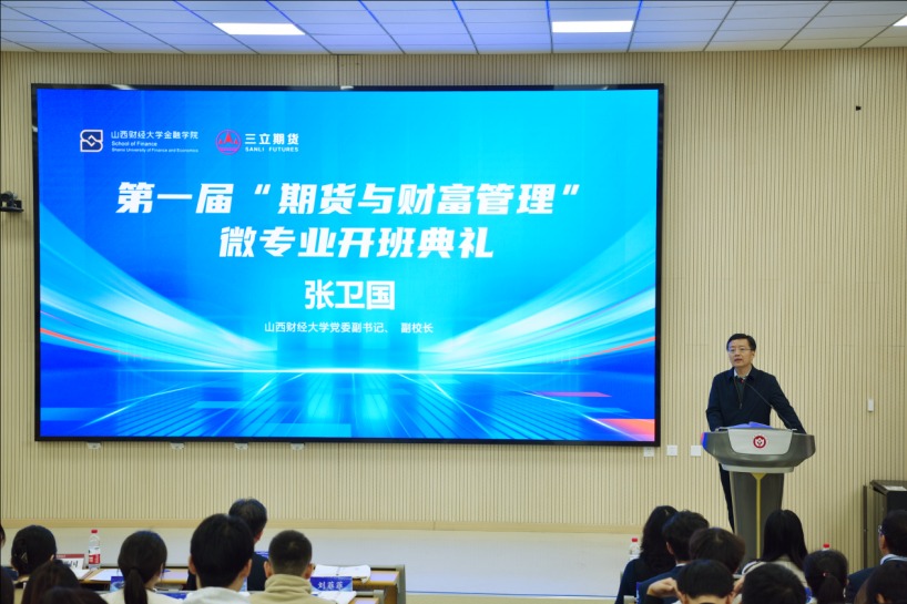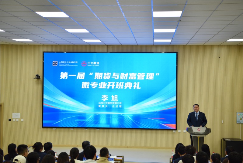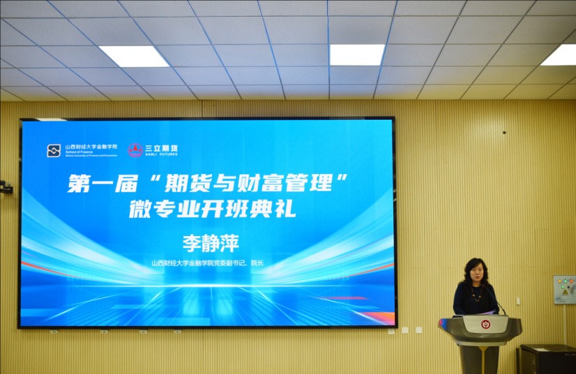 10月31日,山西三立期货有限公司与山西财经大学在修德楼阶梯教室成功举行了“期货与财富管理”微专业项目的开班典礼仪式。此次仪式标志着双方在期货教育领域的深度合作进入了一个新的阶段,旨在共同推动期货人才的培养,为高质量发展提供更多专业人才。此次开班仪式由山西财经大学金融学院院长李静萍主持。出席仪式的有山西财经大学党委常委、副校长张卫国、校教务部副部长闫鑫、金融学院党委书记张继平等党政领导班子及教师、山西三立期货有限公司董事长兼总经理李旭、副总经理史海兵等公司高管及相关部门负责人以及第一期微专业学生共120余人。