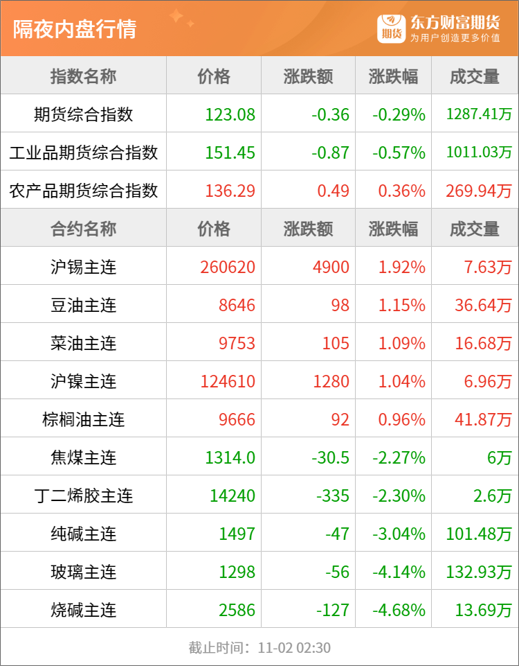 隔夜行情![]() ![]() 每日精选美国“狂野非农”来袭!新增就业仅1.2万人 大幅低于预期 上海市进一步加力支持汽车以旧换新补贴政策实施细则发布 年内涨近50% 氧化铝后市怎么走? 宏观产经央视新闻:外交部发言人林剑表示,为进一步便利中外人员往来,中方决定扩大免签国家范围,自2024年11月8日起对斯洛伐克、挪威、芬兰、丹麦、冰岛、安道尔、摩纳哥、列支敦士登、韩国持普通护照人员试行免签政策。至2025年12月31日期间,9国持普通护照人员来华经商、旅游观光、探亲访友和过境不超过15天,可免办签证入境。 人民日报:改革是利益格局调整的过程,不可能同时满足所有人的利益诉求,随着改革不断推进,对利益关系的触及将越来越深。我们要增强大局意识,正确对待改革中的利益关系调整和个人利害得失。改革也是一个渐进的过程,不可能一蹴而就。不能急于求成、好高骛远,不要把调子起高、胃口吊高,而要实事求是,一切从实际出发,稳扎稳打,积小胜为大胜。 财联社:最新数据显示,10月非农就业人数为1.2万人,事前一致预期为11.3万人,失业率维持在4.1%,符合预期。需要解释的是,这两个数据来自两份不同的调查,其中就业人数来自面向政府机构和企业的抽样调查,失业率则出自面向“打工人”的家庭调查。 品种资讯黑色系期货 钢材:247家钢厂高炉开工率82.44%,环比上周增加0.30个百分点,同比去年增加2.32个百分点;高炉炼铁产能利用率88.4%,环比减少0.08个百分点,同比减少1.83个百分点;钢厂盈利率61.04%,环比减少3.90个百分点,同比增加44.16个百分点;日均铁水产量 235.47万吨,环比减少0.22万吨,同比减少5.93万吨。(Mysteel) 煤炭:截至11月1日当周,钢材期现价格走弱,钢厂盈利率环比减少,且对焦炭提降预期仍存,独立焦企炼焦煤库存环比回落,钢厂炼焦煤库存微增。而煤矿炼焦煤库存增加13.8万吨至290.6万吨,港口炼焦煤库存也增加21.69万吨至837.66万吨。因此,炼焦煤库存整体呈现上游累增下游减少的状态,社会总库存量连增4周至2784.37万吨,创春节以来新高。(Mysteel) 铁矿石:钢之家发布的数据显示,中国各港口11月1日当周的铁矿石总库存1.49亿吨,较前一周上升1%。港口铁矿石总库存较上年同期增长39%。(界面新闻) 锰硅:湖南省地球物理地球化学调查所披露,经过长期勘探,在位于湖南省永州市的祁(阳)零(陵)盆地已累计探获锰矿资源量8400万吨,预计水埠头矿区锰矿资源量有望超1亿吨,祁零盆地锰矿资源整体潜力储量可能达2亿吨以上。(财联社) 农产品期货 棕榈油:据船运调查机构SGS公布数据显示,预计马来西亚10月1-31日棕榈油出口量为1450085吨,较上月同期出口的1197509吨增长21.1%。 据马来西亚独立检验机构AmSpec,马来西亚10月1-31日棕榈油出口量为1581118吨,较上月同期出口的1390806吨增加13.68%。(新华财经) 生猪:据农业农村部监测,11月1日,全国农产品批发市场猪肉平均价格为24.44元/公斤,与上周五(10月25日)的24.67元/公斤相比,下降0.9%。本周的平均价格为24.63元/公斤,与上周24.72元/公斤的均价相比,下降0.4%。本周国内生猪价格呈先降后涨趋势,周均价环比下跌。(财联社) 白糖:郑商所发布关于调整部分指定白糖交割仓(厂)库升贴水的公告,经研究决定,自2025年12月1日起调整部分白糖交割仓(厂)库的升贴水标准;2025年10月1日至11月30日注册的2025/26榨季的白糖仓单须于2025年11月30日注销,2025年12月1日以新的升贴水标准重新注册。升贴水标准具体调整如下。(新华财经) 有色/贵金属期货 碳酸锂:据上海钢联消息,11月1日电池级碳酸锂中间价较前一日上涨1000元/吨,报74000元/吨。(上海证券报) 沪镍:本周中国14港港口镍矿库存减少7.14万湿吨至1497.04万湿吨,降幅0.47%。以镍矿产地分,菲律宾镍矿1434.34万湿吨,其他国家62.7万湿吨;以镍矿品位分,低镍高铁矿662.7万湿吨,中高品位镍矿834.34万湿吨。(Mysteel) 黄金:本周,金价持续攀升,再创新高,一度站上2800美元/盎司关口。今年以来,国际金价累计上涨超32%,年内创新高次数超过30次。与此同时,黄金相关主题基金业绩一路“狂飙”,最高收益达31%。此外,截至三季度末,黄金主题基金总规模环比也涨超6%,多只黄金主题基金三季度份额甚至翻倍。(中国基金报) 能化期货 原油:消息人士透露,沙特阿拉伯可能在12月份下调其销往亚洲的大部分原油品种的价格。调查显示,12月份阿拉伯轻质原油旗舰产品的官方销售价格可能比上月每桶下降30至50美分,这与上月迪拜价差的类似降幅一致。(界面新闻) 美国至11月1日当周石油钻井总数479口,前值480口。(新华财经) 伊拉克石油部声明显示,伊拉克确认已根据对欧佩克+自愿减产的承诺,将石油产量降至330万桶/天。此次减产将在未来几个月内持续实施。(财联社) 苯乙烯:截至10月31日当周,中国苯乙烯工厂整体产量在30.4万吨,环比下降0.92万吨,降幅为2.94%;工厂产能利用率68.31%,环比下降2.07%。(隆众资讯) PVC:截止10月31日,国内PVC生产企业产能利用率在79.19%环比增加1.95%,同比增加2.68%;其中电石法在77.53%环比增加1.24%,同比增加0.56%,乙烯法在83.93%环比增加3.97%,同比增加8.82%。本周PVC企业检修损失量在7.92万吨,较上期减少1.70万吨。生产企业盐湖、联创、东曹、中泰、天业、北元、信发等检修结束,检修减损减少;部分装置负荷变动影响,检修与降幅损失量环比减少8.57%在12.09万吨,同比减少6.46%。(隆众资讯) 其他期货 欧线集运:上海航运交易所数据