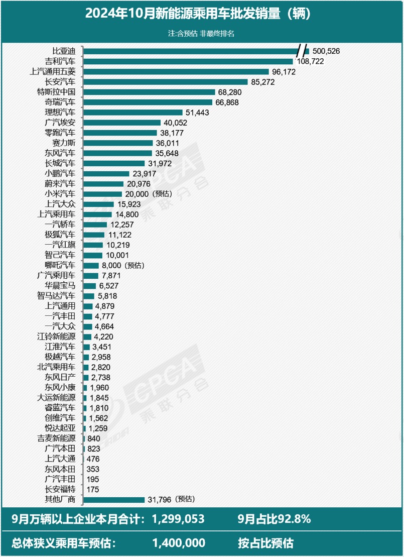 10月新能源乘用车市场预判 截止目前全国所有省份均已出台并落实汽车置换补贴政策,同时推出一定的购车促消费政策,单车补贴金额均较为可观,由此为车市带来新一波增长动力。随着国家报废更新及各地方以旧换新置换政策在10月全面发力,大力拉动车市增长,叠加 “十一”黄金周效应, 10月车市呈高速增长态势,“银九金十”效果显著。近期股市上涨和楼市企稳宣传对居民资产端恢复效应体现,长期向好的股市必然为车市带来持续增长的动力。 国家报废更新补贴标准实施差异化鼓励,对购买新能源乘用车补2万元、购买2.0升及以下排量燃油乘用车补1.5万元,由于报废更新的新能源较燃油车补贴多5000元的补贴优势,加之各地以旧换新政策的新能源车普遍比燃油车多几千元的补贴,因此绝大部分报废更新和以旧换新用户选择购买新能源车。据调研置换新车中的新能源车占比超60%,尤其是推动入门级纯电动车与狭义插混市场强势增长。 “十一”国庆节期间,乘用车市场热度提升显著,节后虽有所回落,但整体车市继续维持回升向好态势。地方以旧换新置换政策对市场的拉动效果逐渐显现,报废更新政策也持续稳定发力,大力拉动车市增长。10月新能源车市终端销量呈现出“金九银十”的旺销趋势,新能源车消费增量贡献巨大。截至10月24日,全国汽车报废更新补贴申请超过157万份,各地汽车置换更新补贴申请超126万份,补贴申请量呈现快速增长态势。近几个月的报废更新申报量环比大幅增长,充分体现了报废更新政策的拉动效果喜人。 近期新能源领军企业的市场优势持续扩大,油电不同权下的市场分化加剧,新能源渗透率不断提升。根据乘联数据,全国乘用车市场2024年9月新能源销量万辆以上厂商的批发销量,占总体新能源乘用车9月全月销量的92.7%。根据初步数据,9月新能源销量万辆以上厂商企业的10月预估销量为130万辆,按照上月结构占比测算10月的全国新能源乘用车批发销量为140万辆。根据乘联数据,由于8到9月新能源车市场零售超厂商国内批发量较大,渠道去库存明显,因此10月新能源车补库带来的批发量增长潜力较大。从国内零售对应预判,应该10月新能源渗透率继续超50%。 综上,根据月度初步数据综合预估,10月全国新能源乘用车厂商批发销量140万辆,同比增长58%,环比增长14%。 10月乘用车主力厂商新能源批发销量 ![]() (文章来源:乘联会) (责任编辑:迷你学人) |