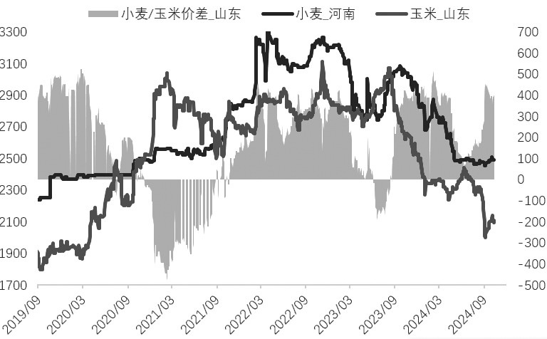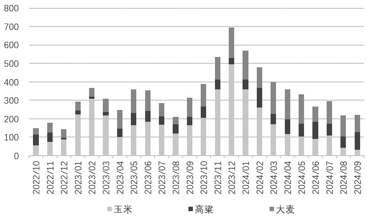 图为2022年10月至今中国进口谷物到港量(单位:万吨) 东北玉米外流增加 从区域价差角度来看,自国庆节以来东北玉米与华北玉米价差有所改善,有利于东北玉米外流。参考机构数据,截至10月29日,华北玉米与东北玉米价差约为80元/吨,而9月27日华北玉米与东北玉米价差约为-140元/吨。参考历史数据及地里位置等因素,我们认为华北玉米与东北玉米合理价差应该维持在150~250元/吨区间值。随着华北玉米与东北玉米价差从低点反弹至当前水平,我们认为东北部分区域玉米可以走汽运发送到华北区域,这在某种程度上会增加东北玉米需求量,进而使得东北玉米价格得到支撑。 除此之外,北港玉米下海量数据也可以验证上述观点。参考机构数据,自2024年10月以来,北方四港玉米周度下海量约为50万吨,相较于此前下海量明显增加。另外,根据细分数据,北方港口玉米发到长江区域数量约为15万吨/周,折算长江口到货量约为60万吨/周,相较2024年5—9月明显增加。需要说明的是,长江区域东北玉米到货量增加,侧面反映东北玉米相较于华北玉米更具有价格优势。从区域价差角度看,这会增加东北玉米外流量,进而支撑东北区域玉米价格。