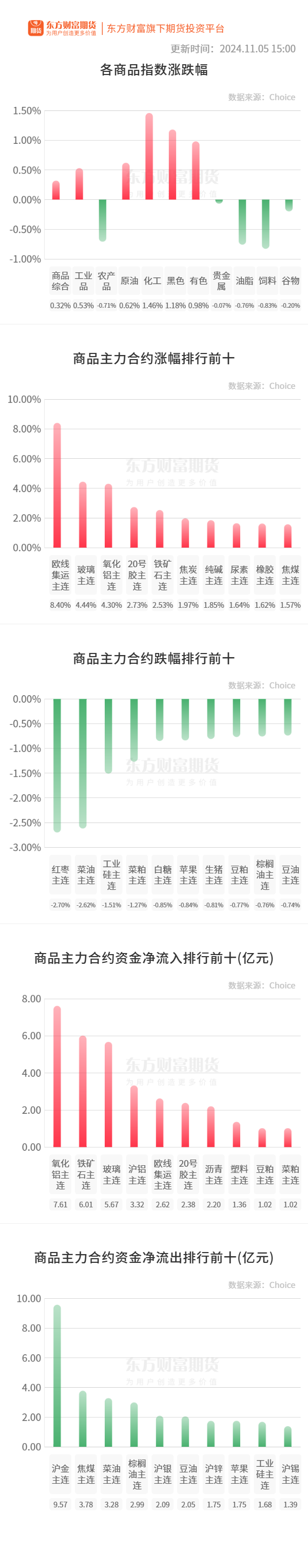行情纵览![]() 宏观产经财联社:随着国务院关于2023年度国有资产管理情况的综合报告11月5日提请十四届全国人大常委会第十二次会议审议,国有资产公布最新“家底”。报告显示,2023年,国有资产管理和改革不断推进,“家底”更加雄厚。下一步,将持续深化国有企业改革,提高国有金融资本服务保障能力,提升行政事业性国有资产管理水平,完善国有自然资源资产管理制度体系,不断完善国有资产报告制度。 财联社:当地时间11月5日,美国新罕布什尔州小镇迪克斯维尔山口公布6位登记选民投票结果,哈里斯和特朗普以3票比3票持平。美国东部时间11月5日零时,新罕布什尔州小镇迪克斯维尔山口的选民率先开始投票,这标志着第60届美国总统选举投票正式开始。 财联社:今日公布的10月财新中国通用服务业经营活动指数(服务业PMI)录得52.0,高于9月1.7个百分点,为近三个月高点,显示服务业景气度回升。 品种资讯黑色系期货 钢材:10月份共有7座高炉进行检修,有18座高炉恢复生产,日均铁水产量增加约4.1万吨。11月计划检修的高炉为3座;计划复产的高炉为6座,日均铁水产量将增加约2.69万吨。(SMM) 铁矿石:11月5日,中国47港进口铁矿石库存总量15939.30万吨,较上周一下降186.05万吨。(我的钢铁网) 农产品期货 菜粕:截至11月1日,沿海地区主要油厂菜籽库存71.75万吨,环比上周增加1.75万吨;菜粕库存6.5万吨,环比上周增加0.25万吨;未执行合同为26万吨,环比上周增加10.7万吨。(我的钢铁网) 棉花:国际棉花咨询委员会(ICAC)发布的数据显示,全球2024/2025年度棉花产量预估为2525.99万吨,同比增加4.7%;全球2024/2025年度棉花期末库存预估为1846.10万吨,同比减少0.5%。(新华财经) 有色/贵金属期货 沪铜:花旗称,铜价将在未来一周内暂时反弹至每吨10000美元;预估2024年铝消费量将实现同比5%的增长,达到580万吨。(财联社) 碳酸锂:上海钢联发布数据显示,今日电池级碳酸锂价格较上日上涨1000元,均价报7.55万元/吨。(每日经济新闻) 沪铝:11月5日广东铝锭库存20.11万吨,较上一交易日减少0.17万吨;无锡铝锭库存16.94万吨,较上一交易日减少0.21万吨;巩义铝锭库存6.55万吨,较上一交易日减少0.15万吨,三地铝锭库存共计减少0.53万吨。(SMM) 能化期货 尿素:2024年11月5日尿素行情涨跌互现,部分地区调整幅度10-20元/吨左右。(农时达情报) 沥青:截至11月4日当周,国内沥青104家社会库库存总量为114.8万吨,环比减少3.5%。在这一周内,全国范围内的社会库存普遍呈现下降趋势,特别是在北方地区,库存的减少更为显著。(隆众资讯) 晚间关注无 (文章来源:东方财富研究中心) (责任编辑:迷你学人) |