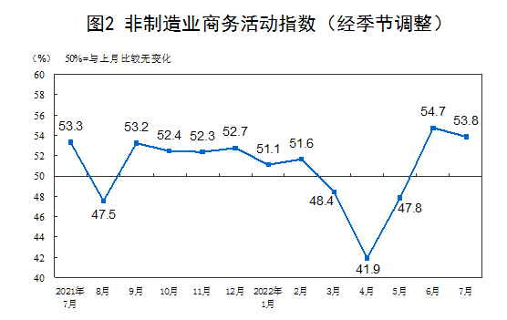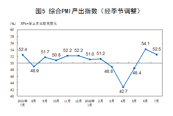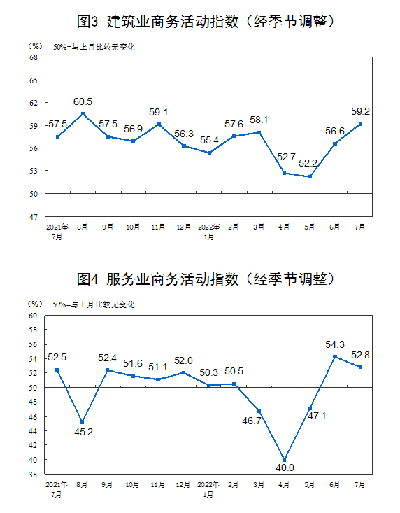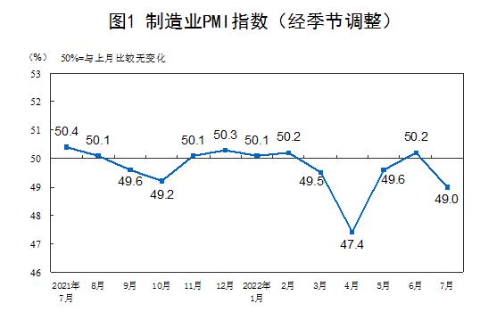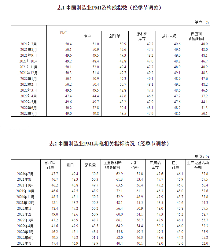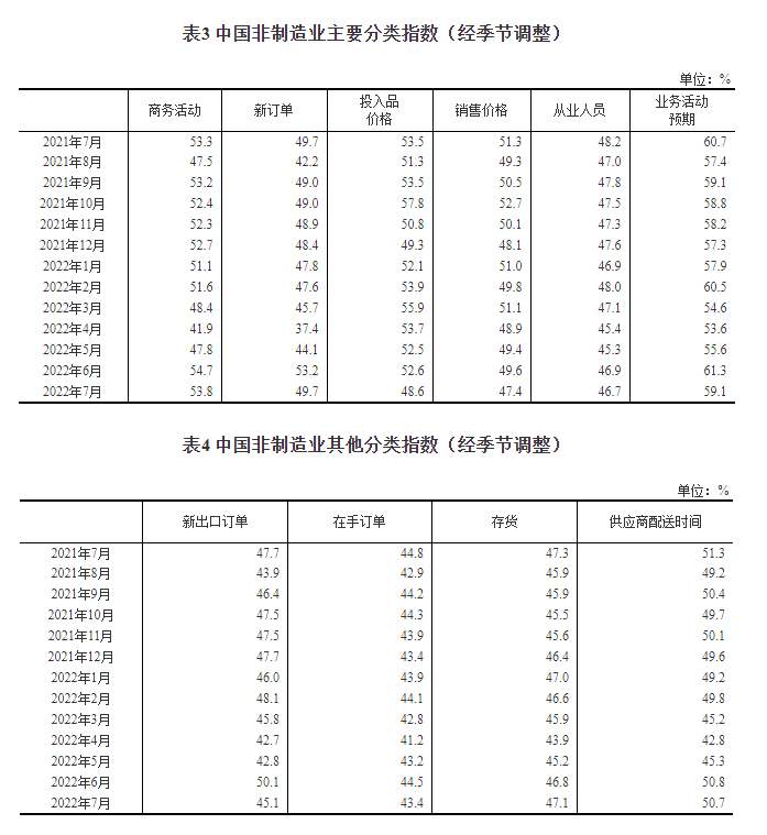 | 一、中国制造业采购经理指数运行情况 7月份,制造业采购经理指数(PMI)为49.0%,比上月下降1.2个百分点,位于临界点以下,制造业景气水平有所回落。 ![]() 从企业规模看,大、中型企业PMI分别为49.8%和48.5%,比上月下降0.4和2.8个百分点,降至临界点以下;小型企业PMI为47.9%,比上月下降0.7个百分点,仍低于临界点。 从分类指数看,在构成制造业PMI的5个分类指数中,供应商配送时间指数高于临界点,生产指数、新订单指数、原材料库存指数和从业人员指数均低于临界点。 生产指数为49.8%,比上月下降3.0个百分点,降至临界点以下,表明制造业生产活动有所放缓。 新订单指数为48.5%,比上月下降1.9个百分点,降至临界点以下,表明制造业市场需求有所回落。 原材料库存指数为47.9%,比上月下降0.2个百分点,表明制造业主要原材料库存量继续减少。 从业人员指数为48.6%,比上月下降0.1个百分点,表明制造业企业用工景气度略有下降。 供应商配送时间指数为50.1%,比上月下降1.2个百分点,仍高于临界点,表明制造业原材料供应商交货时间较上月略有加快。 ![]() 二、中国非制造业采购经理指数运行情况 7月份,非制造业商务活动指数为53.8%,比上月下降0.9个百分点,仍位于扩张区间,非制造业连续两个月恢复性增长。 ![]() 分行业看,建筑业商务活动指数为59.2%,比上月上升2.6个百分点。服务业商务活动指数为52.8%,比上月下降1.5个百分点。从行业情况看,铁路运输、航空运输、住宿、餐饮、电信广播电视及卫星传输服务、生态保护及公共设施管理、文化体育娱乐等行业商务活动指数位于55.0%以上较高景气区间;资本市场服务、保险、房地产、租赁及商务服务等行业商务活动指数低于临界点。 ![]() 新订单指数为49.7%,比上月下降3.5个百分点,降至临界点以下,表明非制造业市场需求有所放缓。分行业看,建筑业新订单指数为51.1%,比上月上升0.3个百分点;服务业新订单指数为49.5%,比上月下降4.2个百分点。 投入品价格指数为48.6%,比上月下降4.0个百分点,降至临界点以下,表明非制造业企业用于经营活动的投入品价格总体水平较上月下降。分行业看,建筑业投入品价格指数为45.0%,比上月下降3.7个百分点;服务业投入品价格指数为49.2%,比上月下降4.1个百分点。 销售价格指数为47.4%,比上月下降2.2个百分点,继续低于临界点,表明非制造业销售价格总体水平降幅扩大。分行业看,建筑业销售价格指数为50.2%,比上月下降0.1个百分点;服务业销售价格指数为46.9%,比上月下降2.6个百分点。 从业人员指数为46.7%,比上月下降0.2个百分点,表明非制造业企业用工景气度有所回落。分行业看,建筑业从业人员指数为47.7%,比上月下降0.6个百分点;服务业从业人员指数为46.6%,与上月持平。 业务活动预期指数为59.1%,比上月下降2.2个百分点,继续高于临界点,表明非制造业企业对近期市场恢复发展总体较为乐观。分行业看,建筑业业务活动预期指数为61.0%,比上月下降2.1个百分点;服务业业务活动预期指数为58.8%,比上月下降2.2个百分点。 ![]() 三、中国综合PMI产出指数运行情况 7月份,综合PMI产出指数为52.5%,比上月下降1.6个百分点,仍高于临界点,表明我国企业生产经营总体继续恢复性扩张。 ![]() 附注 1、主要指标解释 采购经理指数(PMI),是通过对企业采购经理的月度调查结果统计汇总、编制而成的指数,它涵盖了企业采购、生产、流通等各个环节,包括制造业和非制造业领域,是国际上通用的监测宏观经济走势的先行性指数之一,具有较强的预测、预警作用。综合PMI产出指数是PMI指标体系中反映当期全行业(制造业和非制造业)产出变化情况的综合指数。PMI高于50%时,反映经济总体较上月扩张;低于50%,则反映经济总体较上月收缩。 2、调查范围 涉及《国民经济行业分类》(GB/T4754-2017)中制造业的31个行业大类,3200家调查样本;非制造业的43个行业大类,4300家调查样本。 3、调查方法 采购经理调查采用PPS(Probability Proportional to Size)抽样方法,以制造业或非制造业行业大类为层,行业样本量按其增加值占全部制造业或非制造业增加值的比重分配,层内样本使用与企业主营业务收入成比例的概率抽取。 本调查由国家统计局直属调查队具体组织实施,利用国家统计联网直报系统对企业采购经理进行月度问卷调查。 4、计算方法 (1)分类指数的计算方法。制造业采购经理调查指标体系包括生产、新订单、新出口订单、在手订单、产成品库存、采购量、进口、主要原材料购进价格、出厂价格、原材料库存、从业人员、供应商配送时间、生产经营活动预期等13个分类指数。非制造业采购经理调查指标体系包括商务活动、新订单、新出口订单、在手订单、存货、投入品价格、销售价格、从业人员、供应商配送时间、业务活动预期等10个分类指数。分类指数采用扩散指数计算方法,即正向回答的企业个数百分比加上回答不变的百分比的一半。由于非制造业没有合成指数,国际上通常用商务活动指数反映非制造业经济发展的总体变化情况。 (2)制造业PMI指数的计算方法。制造业PMI是由5个扩散指数(分类指数)加权计算而成。5个分类指数及其权数是依据其对经济的先行影响程度确定的。具体包括:新订单指数,权数为30%;生产指数,权数为25%;从业人员指数,权数为20%;供应商配送时间指数,权数为15%;原材料库存指数,权数为10%。其中,供应商配送时间指数为逆