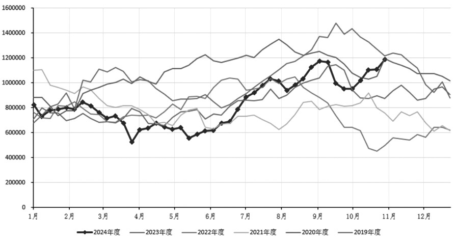 图为中国甲醇港口库存情况(单位:吨) 库存方面,目前上游甲醇企业库存处于中位,比2023年变化不大。上周企业整体出货尚可,西北产区企业可能继续维持低库存策略,短期上游库存不会大幅上升。港口库存方面,今年下半年,受制于需求疲软,港口库存持续高位运行,但受近期伊朗限气发船减少影响,本周港口库存到达近期峰值后或面临下降。 出口方面,近期欧美甲醇价差持续拉大,华东有少量转口行为出现,但当下价差持续回落,持续转港数量可能有限。进口方面,预计2024年10—11月甲醇进口在125万~135万吨,伊朗甲醇进口在80万~90万吨,非伊甲醇进口在40万吨左右。12月受限气影响,伊朗甲醇进口量可能缩减至70万吨以下,整体进口量同比出现下降。 整体来看,近期宏观面影响因素较多,甲醇自身供需面变化不大,港口高库存仍对甲醇形成压制。除非后续政策提振需求预期,短期甲醇大概率底部震荡为主。操作上,暂时观望,等待宏观政策指引或需求端驱动。(作者单位:中信建投期货) (责任编辑:迷你学人) |