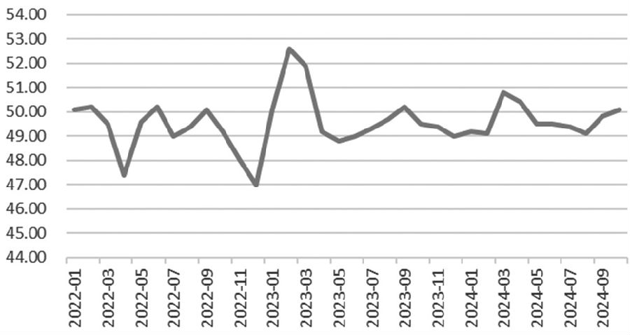 图为创业板指日线走势 经济景气水平继续回升向好 10月制造业 PMI为 50.1%,回升至荣枯线以上。从历史表现来看,2017—2023年10月制造业PMI都处于下行状态,但2024年在政策逆周期调节下出现逆季节性回升。从分项指标来看,生产指数提升0.8个百分点,至52%;新订单指数提升0.1个百分点,至50%。生产端的改善强于新订单,凸显政策逆周期调节的特征。从企业规模来看,大型企业扩张速度加快,PMI提升0.9个百分点,至52.5%,而小型企业景气度仍在荣枯线以下。非制造业方面,受国庆假期出游和资本市场活跃度提升的影响,服务业景气回暖。10月,服务业商务活动指数为50.1%,较上月提升0.2个百分点;服务业新订单指数为47.8%,较上月提升2.8个百分点。 10月高频数据显示,全国新建商品房网签成交量同比增长0.9%,较上月扩大12.5个百分点,在连续15个月下降后首次实现增长;全国二手房网签成交量环比增长4.5%,其中一线城市增长明显,新建商品房网签成交量同比增长14.1%,二手房网签成交量同比增长47.3%。四季度在政策的引导下,预计房地产市场仍呈回暖态势。