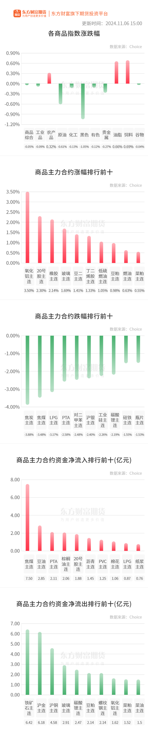 行情纵览![]() 宏观产经中国新闻网:据福克斯测算,美国共和党总统候选人特朗普在2024年美国大选中已获得当选总统所需的270张选举人票。 21财经:11月6日,工业和信息化部副部长熊继军在第七届虹桥国际经济论坛“全球新能源汽车的未来”分论坛指出,工信部接下来将编制新能源汽车换电模式指导意见,研究加快推动商用车电动化的政策举措,促进新能源汽车全面市场化拓展。同时,进一步的优化发展环境,鼓励优质企业兼并重组,做大做强,推动提高产业的集中度,会同相关部门打击不正当的竞争行为,营造公平有序的市场环境。 品种资讯黑色系期货 铁矿石:据SMM调研,11月6日,SMM统计的242家钢厂高炉开工率为90.60%,环比持平。高炉产能利用率为91.05%,环比下降0.12%。样本钢厂日均铁水产量小幅下滑。(SMM) 螺纹钢:11月6日午后唐山钢坯仓储现货价格较午前上涨30元/吨,报3230元/吨-3240元/吨含税出库。(Mysteel) 农产品期货 淀粉:据Mysteel农产品调查数据显示,近期受到玉米淀粉行业利润的持续推动与前期企业检修的结束,玉米淀粉行业开机环比继续升高。 本周(10月25日-11月6日)全国玉米加工总量为68.4万吨,较上周增加2.18万吨;周度全国玉米淀粉产量为35.13万吨,较上周产量增加1.6万吨;周度开机率为67.91%,较上周升高3.09%。 (备注:2024年11月6日,当日开机率为70.71%)(Mysteel) 鸡蛋:根据Mysteel鸡蛋团队对全国10个地区,31个产区市场的最新调查数据显示,2024年11月6日,全国生产环节库存为1.56天,较昨日增加0.01天流通环节库存为1.98天,较昨日增加0.01天单位:天 。(Mysteel) 花生:根据Mysteel农产品对全国主要油厂的调查情况显示,2024年第43周(10月25日至11月1日)国内花生油样本企业花生压榨量为10095吨,开机率为7.6%,较上周有所上升。(Mysteel) 有色/贵金属期货 沪铝:据Mysteel了解,贵州电解铝厂A已复产32台槽子,复产进度偏慢;贵州电解铝厂B二期项目已投产54台槽子,剩余电解槽暂缓启动;四川电解铝厂A已复产60%,复产偏慢。西南电解铝企业整体复产偏慢,主要受制于成本高企影响。(Mysteel) 工业硅:今日工业硅供应端维稳运行,市场成交不足,下游成交偏清淡,成交量没有明显起色,多空双方处于弱平衡状态。(隆众资讯) 沪铜:11月6日上海保税区市场国际铜现货价格为68511元/吨,下调187元/吨。(Mysteel) 能化期货 甲醇:截至2024年11月6日,中国甲醇港口库存总量在120.64万吨,较上一期数据增加1.86万吨。其中,华东地区窄幅去库,库存减少0.35万吨;华南地区累库,库存增加2.21万吨。(隆众资讯) 尿素:2024年11月6日尿素行情稳中上扬,部分地区上调10-40元/吨左右。(农时达情报) 原油:美国石油协会(API)数据显示,11月1日当周,美国API原油库存313.2万桶,前值-57.3万桶。(新华财经) 晚间关注无 (文章来源:东方财富研究中心) (责任编辑:迷你学人) |