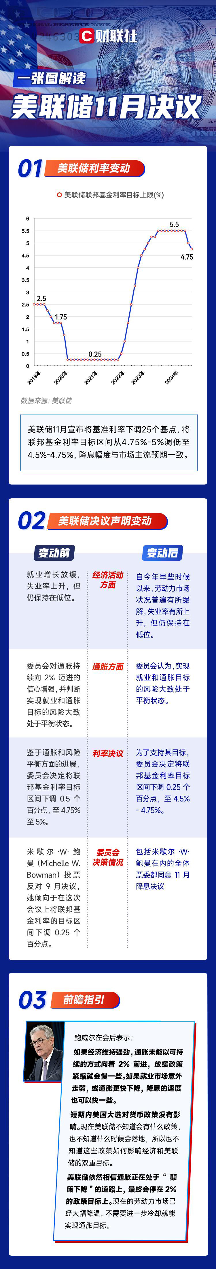 一图解读美联储11月决议:如约降息25基点 相信通胀仍在“颠簸下降” 财联社 11月08日 ①美联储11月宣布将基准利率下调25个基点,降息幅度与市场主流预期一致。②美联储依然相信通胀正在处于“颠簸下降”的道路上,最终会停在2%的政策目标上。同时认为,现在的劳动力市场已经大幅降温,不需要进一步冷却就能实现通胀目标。(文章来源:财联社) (责任编辑:迷你学人)