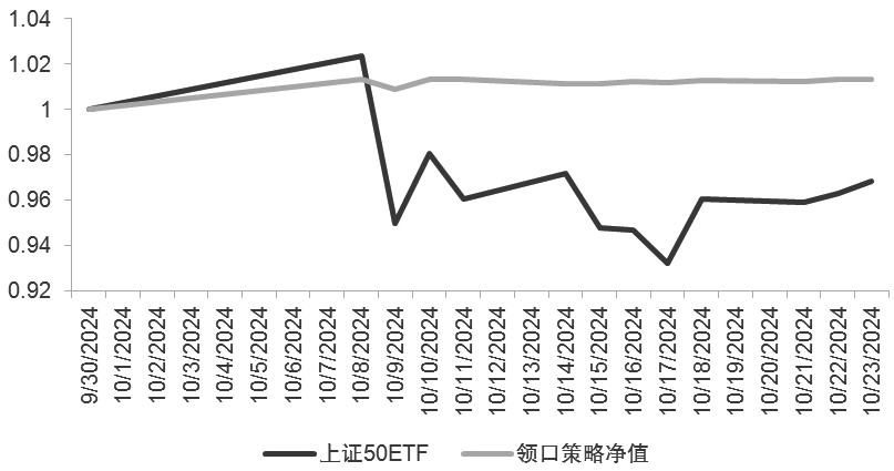 9月24日,国务院新闻办公室举行新闻发布会,中国人民银行、国家金融监管总局、中国证监会主要负责人介绍了金融支持经济高质量发展有关情况。降准降息、降低房贷利率等多项重磅政策同时推出,提升了市场情绪、提高了交易信心,随后A股出现罕见的放量大涨行情。 自9月24日至10月8日6个交易日,上证50、沪深300、中证500、中证1000涨跌幅分别为27.20%、32.47%、36.95%、38.77%。从资金面来看,成交额较前期明显放大,上证50、沪深300、中证500、中证1000日均成交额为1562.70亿元、5203.16亿元、2648.68亿元、3071.78亿元,换手率也处在较高水准。国庆节前五个交易日资金均表现为净主动买入,节后有部分资金止盈卖出。 本轮行情具有启动位置低、涨速快、成交量明显放大且换手率高等特征,与1999年的“5·19行情”、2008年底、2014年底与2019年初的由一揽子政策驱动的快速上涨行情有许多相似之处。此类由政策驱动的快速放量上涨行情在初期大涨后往往会进入震荡调整期,虽有政策托底,短期内大幅下跌可能性较小,中长期走势依旧偏多,但仍需要后续基本面持续改善才能真正反转进入牛市。A股10月8日后的走势也验证了这一点,10月9日股市获利回吐,成交量下降,多空分歧加大,进入震荡整理。 对于持有股指或ETF现货头寸的投资者,在“价波双降”的行情下,利用期权领口策略控制回撤不失为一个好的选择。 领口策略主要由三个部分组成,一是持有标的,二是买入看跌期权,为我们标的的下跌风险进行保险,三是卖出上方看涨期权以降低第二部分保护性看跌期权持仓成本。领口策略适用于在中长期看好并打算持续持有标的,在保护性看跌期权的基础上卖出看涨期权降低看跌期权这一“保险”的成本。 对领口策略中看跌期权行权价选择问题,当预计标的价格小幅下跌或者是横盘震荡,则选择浅虚值看跌期权节约成本。而若预计未来突发事件会导致标的出现较大跌幅时,可以选择深度虚值的看跌期权。由于深度虚值的看跌期权权利金较低,同样的资金可以购买数量更多的深虚值看跌期权,这意味着在标的价格下跌时,投资者可能获得更高的收益用来对冲标的下跌带来的损失。值得注意的是,对于领口策略来说,标的和买入看跌期权、卖出看涨的比例为1∶1∶1,而选择买入数量更多的深虚值看跌期权,将会导致组合风险敞口变化,亏损和收益都有可能变大,并不是标准的领口期权。 看涨期权行权价同样也可根据对未来走势的判断来确定,但因为一旦卖出看涨期权会锁定利润上限且标的大幅上涨卖出看涨期权损失较大,所以通常选择虚值程度较高的期权。 以上证50ETF期权具体举例,由于担心国庆假期期间突发事件风险和本轮上涨的持续性,但中长期仍看好上证50ETF,投资者选择通过领口策略进行保护。在国庆节前一个交易日即9月30日选择以收盘价买入50ETF沽2024年10月2900这一浅虚值看跌期权。由于当天50ETF大幅上涨,当天并不存在虚值看涨期权,因此选择卖出50ETF购2024年10月2900这一行权价最高的看涨期权,此时标的价格为2.909。持有这一领口策略至10月23日到期,该组合净值变化为:上证50ETF收益率为-3.16%,最大回撤为8.93%;领口策略收益率为1.34%,最大回撤为0.44%。