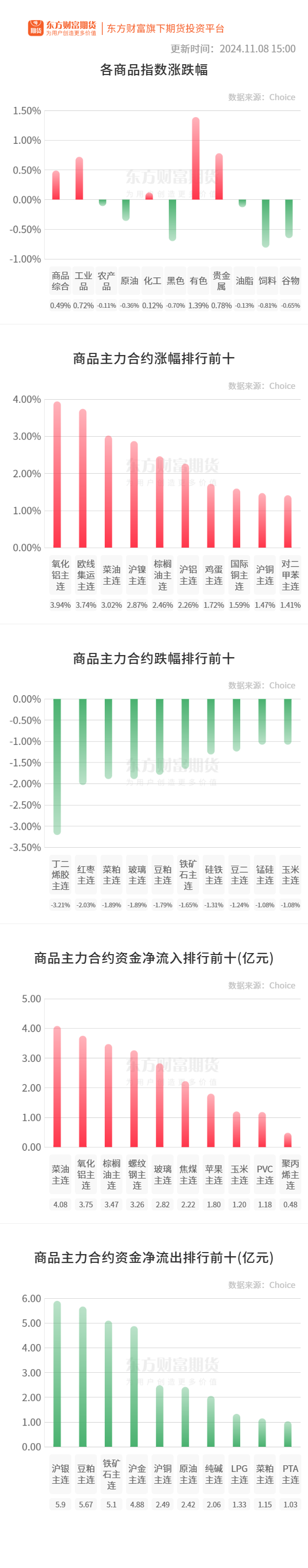 行情纵览![]() 宏观产经财联社:上海市商务委等12部门印发《本市关于更好发挥消费信贷促进消费提质升级作用的实施意见》。其中提出,扩大汽车消费。推动汽车换“能”,打好“政府补贴+厂商优惠+金融机构购车礼”组合拳。在依法合规、风险可控前提下,适当放宽汽车消费信贷申请条件,优化汽车贷款流程,鼓励金融机构推广线上即时办理贷款服务。 大河财立方:为维护银行体系流动性合理充裕,2024年11月8日,中国人民银行以固定利率、数量招标方式开展了122亿元逆回购操作,中标利率1.50%,与此前持平。因今日有171亿元7天期逆回购到期,央行当日实现净回笼49亿元。 品种资讯黑色系期货 螺纹钢:截至11月8日,247家钢厂高炉开工率82.29%,环比上周减少0.15个百分点,同比去年增加1.28个百分点;高炉炼铁产能利用率87.87%,环比减少0.53个百分点,同比减少1.36个百分点。(Mysteel) 铁矿石:Mysteel统计全国45个港口进口铁矿石库存总量15269.06万吨,环比降150.92万吨,45港日均疏港量314.39万吨,环比降5.73万吨。(Mysteel) 全国样本生铁企业64座高炉中有28座停产检修,检修高炉容积合计6587m³,周度产能利用率为63.94%,周环比上升2.17%,月环比上升5.69%。厂内生铁库存52.83万吨,周环比增加3.91万吨。(Mysteel) 焦炭:截至11月8日当周,全国247家钢厂样本焦炭日均产量46.91万吨,增0.02万吨;产能利用率86.61%,增0.03%;焦炭库存581.52万吨,增2.73万吨;炼焦煤库存741.18万吨,减1.22万吨;喷吹煤库存390.93万吨,增1.33万吨。(Mysteel) 锰硅:截至11月8日当周,全国187家独立硅锰企业样本开工率为43.06%,较上周减少1.69%;日均产量为27090吨,环比减少110吨。(Mysteel) 农产品期货 鸡蛋:据农业农村部监测,截至11月8日14:00时,全国农产品批发市场猪肉平均价格为24.24元/公斤,较前一日持平;鸡蛋平均价格为10.37元/公斤,较前一日下降0.1%。(新华财经) 豆油:中储粮网发布11月8日油脂公司国产豆油购销双向竞价交易结果,计划成交9822吨,实际成交9822吨,成交率100%。(新华财经) 菜籽:加拿大谷物委员会发布的数据显示,截至11月3日当周,加拿大油菜籽出口量较前周减少33.3%至20.41万吨,之前一周为30.6万吨。自2024年8月1日至2024年11月3日,加拿大油菜籽出口量为309.97万吨,较上一年度同期的158.19万吨增加95.9%。截至11月3日,加拿大油菜籽商业库存为148.85万吨。(新华财经) 有色/贵金属期货 碳酸锂:11月8日,上海钢联发布数据显示,今日电池级碳酸锂价格较上日上涨500元,均价报7.60万元/吨。(每日经济新闻) 工业硅:今日工业硅供应端整体持稳,下游需求仍旧表现一般,实际成交以刚需为主,厂商挺价心态严重,无利好因素支撑,向上拉涨动力不足。(隆众资讯) 沪铝:11月8日广东铝锭库存19.49万吨,较上一交易日减少0.26万吨;无锡铝锭库存16.63万吨,较上一交易日减少0.04万吨;巩义铝锭库存5.06万吨,较上一交易日减少0.34万吨,三地铝锭库存共计减少0.56万吨。(SMM) 能化期货 苯乙烯:最新数据显示,截至11月7日当周,中国苯乙烯工厂整体产量在30.37万吨,环比下降0.03万吨,降幅为0.1%;工厂产能利用率为67.86%,环比下降0.45%。(隆众资讯) 尿素:商务部发布2025年化肥进口关税配额总量、分配原则及相关程序。2025年化肥进口关税配额总量为1365万吨。其中,尿素330万吨;磷酸氢二铵690万吨;复合肥345万吨。2025年化肥国营贸易关税配额数量分别为:尿素297万吨,磷酸氢二铵352万吨,复合肥176万吨。(财联社) 聚丙烯:本周PP产能利用率环比下降0.11%至74.94%,本周国内聚丙烯下游行业平均开工上涨0.50个百分点至52.47%。(隆众资讯) 晚间关注无 (文章来源:东方财富研究中心) (责任编辑:迷你学人) |