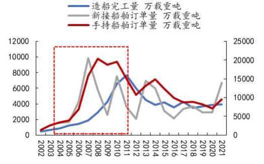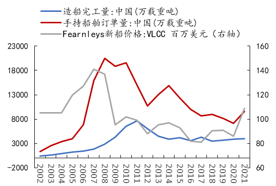 | 1、船舶中观景气度分析:新一轮景气上行周期或将开启 以史为鉴,上一轮船舶周期或暗含三大重要启示。船舶作为典型的周期性行业,通过历史上三大造船指标1观察,我国船舶行业一个完整周期的平均跨度大概是20~25 年,其中上行周期略长于下行周期。 回测显示,上一轮我国船舶上行周期始于1996年,截至2008年手持船舶订单已达到约2亿载重吨“峰值”,对标Fearnleys:新船价格(VLCC)亦达到接近1.6亿美元高点。考虑到造船完工周期滞后于手持订单周期约3年,因此实际船舶上行周期“峰值”发生在2011年。FY2011船舶制造业营收/净利润增速分别为70%/56%,为该轮船舶上行周期的次高水平2,随后船舶制造业便进入到9年漫长的下行周期。 综上,给予我们重要启示有三:一是新船价格上涨周期与手持订单周期几乎同步;二是造船完工周期滞后于手持订单周期约3年;三是船舶制造业盈利景气周期与造船完工周期基本一致。 我们判断新一轮船舶上升周期或已开启,下面将从新订单、手持订单、供需关系及造船完工量(交付)等四个维度展开剖析: