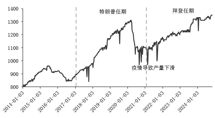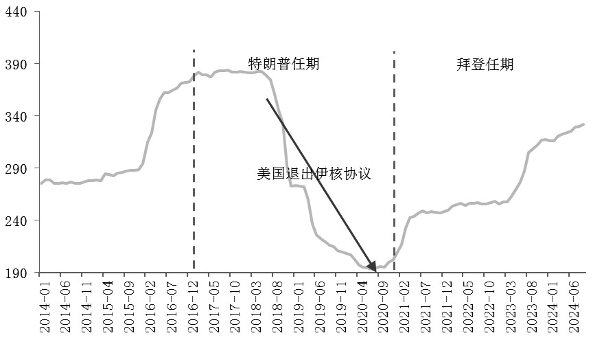 图为伊朗原油产量(单位:万桶/天) 中期伊朗供应存在不确定性。特朗普上个任期,在2018年5月宣布退出伊核协议,并重启对伊朗的制裁,伊朗原油产量从382.2万桶/天的高位,最低下滑至2020年7月的193万桶/天,下滑幅度高达189.2万桶/天。2021年1月,拜登上任后,伊朗原油出口逐步有所放松,加之出口方式上的规避,2024年9月伊朗原油产量已回升至331.6万桶/天,逐渐接近被制裁前的水平。因此,若明年特朗普上台后再度加剧对伊朗的制裁,短期内的断供风险或抬升油价,若制裁力度较大,伊朗对此进行报复,地缘风险将进一步上行。 另外,需要关注特朗普上台后对伊朗和以色列的态度,以及地缘风险是否升级。考虑到OPEC闲置产能充足,以2024年9月产量为基准,沙特闲置产能高达310万桶/天,阿联酋、科威特、伊拉克闲置产能分别为100万桶/天、40万桶/天、60万桶/天,总计达510万桶/天,OPEC能以较快速度对伊朗被制裁的供应缺口进行弥补,伊朗封锁霍尔木兹海峡的极端情况除外。 特朗普政策主张倾向于提升油气产量。截至11月1日当周,美国原油产量为1350万桶/天,处于历史高位。飓风“拉斐尔”过后,美国墨西哥湾超过25%的原油和16%的天然气产量仍然处于停产状态,未来几周内或逐渐恢复。特朗普主张放松环境监管,给予传统能源税收优惠,优先进行钻探,将在上任一年内降低能源价格,包括汽油、空调和供暖,该政策效果或在中期逐渐显现,美国原油产量将有所增加。