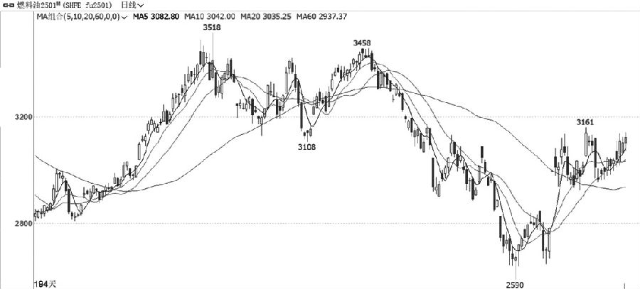 集运欧线2502合约近期价格上涨至3471.8点一线后有所回落。量能方面,在本轮价格上涨过程中,成交量和持仓量均稳步上涨。指标方面,均线系统处于多头排列,MACD指标快慢线继续在零轴上方运行。综合来看,集运欧线2502合约近期价格沿短期均线震荡走强,但短期价格冲高回落有所调整,关注下方10日均线位置的支撑。 燃料油 等待突破
