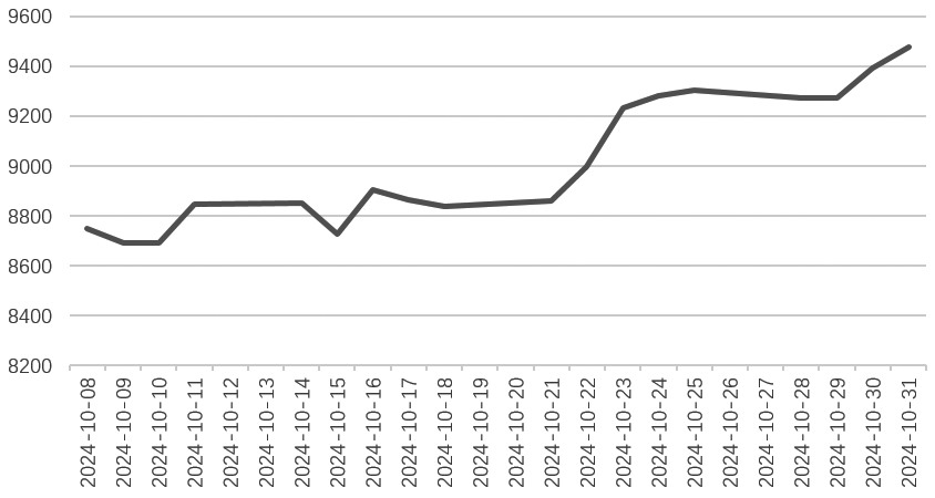 图为10月棕榈油期货主力合约走势 从海外的相关动态可以看出,主产地印度尼西亚和马来西亚面对急剧上涨的棕榈油价格,实施了不同的调价措施。印度尼西亚方面,农业部长重申该国计划执行40%的生物柴油强制掺混计划,从2025年1月开始启动,并称未来该国将努力实施B50计划。马来西亚方面,财政部公布的预算文件显示,当毛棕榈油市场价格突破每吨4050马币时,出口税率将上调至10%,并于11月1日起实施。从产地官方的态度可以看到,基本面呈现出供给紧缺、需求强劲的态势。马来西亚棕榈油局10月份供需报告也反映出马来西亚棕榈油供应偏紧。2024年10月马来西亚棕榈油产量为179.73万吨,较9月的182.19万吨下降1.35%,出口量为173.24万吨,较9月的155.98万吨增加11.07%。10月月末库存为188.46万吨,较9月的201.18万吨下降6.32%。 往后看,产地即将进入降雨偏少的季节性减产周期,随着产量下滑,若出口保持环比增长的走势,库存预计较难累积,马来西亚和印度尼西亚两地棕榈油紧缺的局面难以改变。此外,值得关注的是,受天气和病虫害的影响,为保护其国内农民和消费者不受价格上涨的影响,泰国贸易部已禁止棕榈油出口。棕榈油产地供应紧缺的现实成为推动棕榈油价格上涨的主要因素,伴随着食用油价格的上涨,棕榈油价格高企或已成为今年的主旋律。 地缘因素导致的紧张局势,尤其以中东地区为代表的紧张局势,加剧了原油价格的波动。每当该地区紧张局势升级,原油市场的风险溢价必会上升,间接提振了以棕榈油等植物油为生物燃料原料的需求。天气方面,随着厄尔尼诺现象逐步消退,天气条件趋于正常,对印尼地区棕榈油产量的影响将会逐步消退。目前从NOAA的天气预测模型来看,年内出现拉尼娜的概率已下降至60%,但主产地即将步入季节性减产阶段,尽管极端天气对产量的影响逐步减弱,但库存难以累积,去化的库存对盘面仍具有一定的支撑。