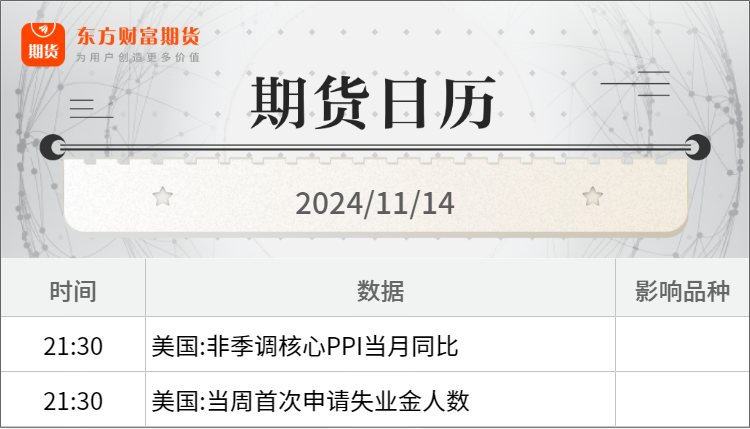 隔夜行情![]() ![]() 每日精选碳酸锂价格 见底回升? 天胶继续下跌?关注这一变化 如若OPEC+取消自愿减产计划会怎样?分析:油价明年或“腰斩” 宏观产经央视新闻:财政部、税务总局、住房城乡建设部发布《关于促进房地产市场平稳健康发展有关税收政策的公告》,明确多项支持房地产市场发展的税收优惠政策。契税方面,将现行享受1%低税率优惠的面积标准由90平方米提高到140平方米,并明确北京、上海、广州、深圳4个城市可以与其他地区统一适用家庭第二套住房契税优惠政策。调整后,在全国范围内,对个人购买家庭唯一住房和家庭第二套住房,只要面积不超过140平方米的,统一按1%的税率缴纳契税。 财联社:美国10月CPI同比上升2.6%,预估为上升2.6%,前值为上升2.4%;美国10月CPI环比上升0.2%,预估为上升0.2%,前值为上升0.2%。美国10月核心CPI同比上升3.3%,预估为上升3.3%,前值为上升3.3%;美国10月核心CPI环比上升0.3%,预估为上升0.3%,前值为上升0.3%。 国家安全部:金融安全是经济平稳健康发展的重要基础,通常指一国的金融体系能够抵御内外部冲击,金融主权相对处于没有危险和不受威胁,国家其他利益处于免受金融手段或渠道所致危险威胁的状态。维护金融安全,防范化解金融风险,特别是防止发生系统性金融风险,是金融工作的根本性任务,也是金融工作的永恒主题。 品种资讯黑色系期货 钢材:2024年11月上旬,重点统计钢铁企业共生产粗钢2096万吨,平均日产209.6万吨,日产环比增长0.1%;生铁1882万吨,平均日产188.2万吨,日产环比下降0.1%;钢材1953万吨,平均日产195.3万吨,日产环比下降7.8%。 21个城市5大品种钢材社会库存693万吨,环比减少7万吨,下降1.0%,库存降幅收窄;比年初减少36万吨,下降4.9%;比上年同期减少99万吨,下降12.5%。11月上旬,螺纹钢库存252万吨,环比增加10万吨,上升4.1%,库存由降转升;比年初减少53万吨,下降17.4%:比上年同期减少53万吨,下降17.4%。(中国钢铁工业协会) 11月13日,76家独立电弧炉建筑钢材钢厂平均成本为3525元/吨,日环比增加1元/吨。平均利润为-45元/吨,谷电利润为71元/吨,日环比减少8元/吨。(Mysteel) 铁矿石:据兰格钢铁网调研,截至11月13日,全国201家生产企业铁水日均产量为222.10万吨,周环比减少0.59万吨,总体月环比增加0.81万吨;9月日均铁水产量为216.81万吨,10月日均铁水产量为221.23万吨,11月日均铁水产量为222.40万吨。(新华财经) 煤炭:全国大部分区域气温偏暖,居民用电不及往年,市场煤炭成交减少,下游终端采购拉运量放缓,沿海煤炭运价小幅下行。(上海航运交易所) 农产品期货 生猪:截至11月13日14时,全国农产品批发市场猪肉平均价格为24.20元/公斤,较前一日上升0.2%。(农业农村部) 棕榈油:11月13日马来西亚棕榈油离岸价为1192.5美元,较上日跌52.5美元,进口到岸价为1222.5美元,较上日跌52.5美元,进口成本价为10584.12元,较上日跌421.73元,结束四连涨,自近两年半高位回落。进口利润为负624.12元/吨,较上日下跌18.27元/吨。(中国粮油商务网) 白糖:11月13日广西白糖现货成交价为5940元/吨,上涨25元/吨;广西制糖集团新糖报价为6200~6300元/吨,陈糖报价6250元/吨,个别下调20元/吨;云南制糖集团陈糖报价6200元/吨,新糖报价6250元/吨;加工糖厂主流报价区间为6400~6580元/吨,报价均持平。(泛糖科技) 有色/贵金属期货 沪铜:花旗将铜的0-3个月目标价从9500美元下调至8500美元,预计铜价将在年末跌至8500至9000美元/吨。(财联社) 碳酸锂:11月13日下午,雅保公司电池级碳酸锂竞标活动结束。本次招标量级为100吨,中标价格为83400元/吨,为国内自提。(上海有色网) 上海钢联发布数据显示,11月13日电池级碳酸锂价格较上日上涨3000元,均价报8.00万元/吨。(财联社) 工业硅:11月13日,据中国有色金属工业协会硅业分会消息,本周工业硅现货价格整体持稳。本周工业硅现货价格继续维持稳定,下游维持刚需采购,观望氛围浓厚,市场成交平淡,西南地区开工处于低位,市场总体供应减少,厂家挺价意愿强烈。(界面新闻) 能化期货 甲醇:截至2024年11月13日,中国甲醇港口库存总量在125.28万吨,较上一期数据增加4.64万吨。其中,华东地区累库,库存增加6.6万吨;华南地区去库,库存减少1.96万吨。(隆众资讯) 纸浆:山东地区针叶浆市场主流品牌报价在5780-6220元/吨,主流针叶浆价格较前一工作日上涨20-30元/吨。11月13日山东地区纸浆市场区间内整理运行,市场交投情绪一般,业者报盘较前一工作日上涨20-30元/吨,实单成交可商议。(隆众资讯) 沥青:截止11月12日当周,国内沥青54家企业厂家样本出货量共46.8万吨,环比增加21.8%。(隆众资讯) 环球视野央视新闻:当地时间13日,总部位于比利时布鲁塞尔的欧洲汽车制造商协会发表声明说,2025年纯电动汽车市场份额的预测大幅下调,从年初的27%降至目前的21%。 财联社:美国通胀数据公布后,交易员加大了对美联储12月降息的押注。交易员现在定价美联储12月降息的可能性约为75%,而美国通胀数据公布前为60%。 每日关注![]() (文章来源:东方财富研究中心) (责任编辑:迷你学人) |