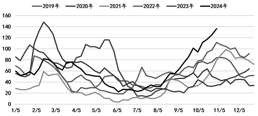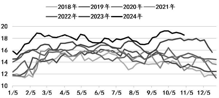 图为尿素周度产量(单位:万吨) 从不同生产工艺的尿素成本来看,目前水煤浆工艺完全生产成本约1700元/吨,对应理论生产利润0~100元/吨;西南原料天然气价格为2.21元/立方米,天然气生产完全成本为1800元/吨,对应理论生产利润为0元/吨;原料无烟块煤价格为1200元/吨,固定床工艺完全生产成本在1800~1900元/吨,对应理论生产利润为-150~-50元/吨。近半年来,固定床工艺生产利润持续低迷。 供应方面,2024年10月尿素产量为588万吨,较9月增长4.44%。2024年国内尿素生产利润明显低于2022年和2023年。由于尿素新增投产产能逐步增加,导致尿素供应量处于历史高位,预计2024年全年国内尿素生产总量为6580万吨,同比增长约13%,增产幅度较大。 新增产能方面,2024年11月初,华鲁恒升荆州二期年产能52万吨尿素新装置已投料,后续开始造粒生产,日产量逐渐提升。但后续天然气制尿素生产装置存在检修可能,日产量有可能出现小幅下降。相关数据显示,截至2024年11月7日,国内尿素年度总产能达到7460万吨,创近5年新高。2025年尿素仍有新建产能待投产,如果按照相对确定投产的新产能为380万吨计算,2025年国内尿素产能将达到7840万吨,尿素日产量可能达到22万吨。不过,具体投产进度需进一步跟踪和观察。 需求方面,如果宏观政策持续带来利好驱动,尿素的农业和工业需求有望恢复,投资者可持续关注12月国内宏观政策的发布和落地情况。从下游情况看,目前农业终端需求并无明显起色,以应对冬季储备为主,但市场对2025年春季用肥的需求预期并不乐观,储备积极性不高。工业需求方面,胶板厂开工率不高,以刚需采购为主,短期复合肥工厂因为尿素原料较多,拿货积极性不高,预计11月下旬和12月开工率有回升趋势,需求可能出现修复。
