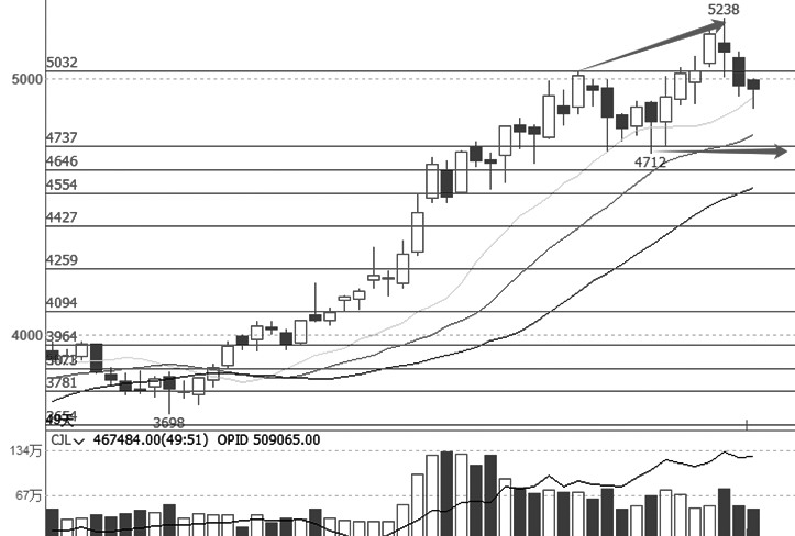 氧化铝 指标背离 李卫东 11月14日 从氧化铝加权日线走势图看,氧化铝经过一轮大涨见顶5238元/吨后,展开回落,同时技术指标出现顶部背离。但是从背离的跨度来看,最近的回落应该只是调整,目前均线系统维持多头排列,持仓不断扩张,同时价格依然处于前期调整低点4712元/吨之上。这就标志着目前价格依然处于上涨趋势当中,在跌破重要支撑之前,价格虽会有调整,但趋势不变。即便是转势,也不是一蹴而就的,需要一个过程。(中辉期货 李卫东) (责任编辑:迷你学人)