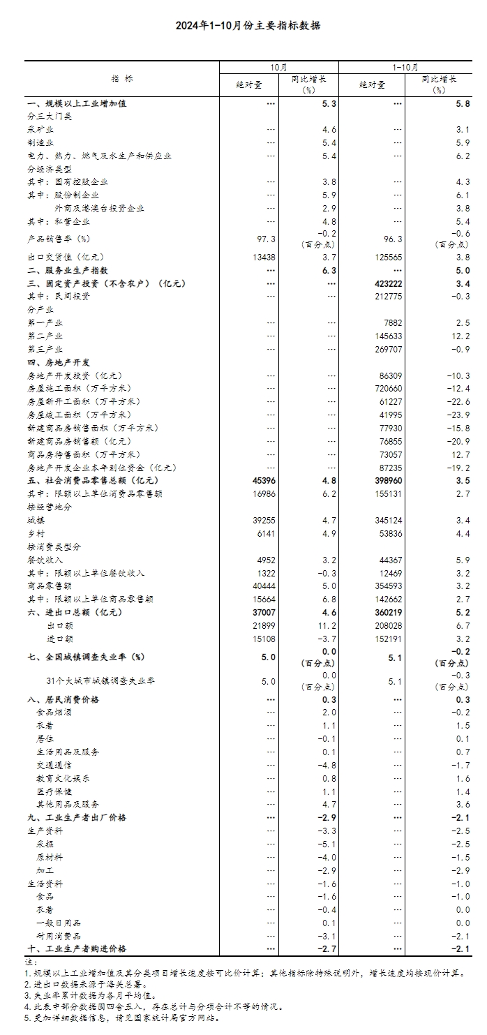 10月份,在以习近平同志为核心的党中央坚强领导下,各地区各部门深入贯彻落实党中央、国务院决策部署,坚持稳中求进工作总基调,完整、准确、全面贯彻新发展理念,一系列存量政策和增量政策协同发力、持续显效,消费、服务业、进出口等主要经济指标明显回升,就业物价总体稳定,社会预期持续改善,高质量发展扎实推进,积极因素累积增多,国民经济运行稳中有进、稳中有升。 一、工业生产增势稳定,装备制造业和高技术制造业较快增长 10月份,全国规模以上工业增加值同比增长5.3%,比上月回落0.1个百分点;环比增长0.41%。分三大门类看,采矿业增加值同比增长4.6%,制造业增长5.4%,电力、热力、燃气及水生产和供应业增长5.4%。装备制造业增加值同比增长6.6%,高技术制造业增加值增长9.4%,分别快于全部规模以上工业增加值1.3和4.1个百分点。分经济类型看,国有控股企业增加值同比增长3.8%;股份制企业增长5.9%,外商及港澳台投资企业增长2.9%;私营企业增长4.8%。分产品看,新能源汽车、工业机器人、集成电路产品产量同比分别增长48.6%、33.4%、11.8%。1-10月份,全国规模以上工业增加值同比增长5.8%,与1-9月份持平。10月份,制造业采购经理指数为50.1%,比上月上升0.3个百分点;企业生产经营活动预期指数为54.0%,上升2.0个百分点。1-9月份,全国规模以上工业企业实现利润总额52282亿元,同比下降3.5%。 ![]() 二、服务业明显加快,现代服务业发展较好 10月份,全国服务业生产指数同比增长6.3%,比上月加快1.2个百分点。分行业看,金融业,信息传输、软件和信息技术服务业,租赁和商务服务业生产指数同比分别增长10.2%、9.5%、8.8%,分别快于服务业生产指数3.9、3.2、2.5个百分点。1-10月份,全国服务业生产指数同比增长5.0%,比1-9月份加快0.1个百分点。1-9月份,规模以上服务业企业营业收入同比增长7.2%。10月份,服务业商务活动指数为50.1%,比上月上升0.2个百分点;服务业业务活动预期指数为56.2%,上升1.6个百分点。其中,铁路运输、水上运输、航空运输、邮政、资本市场服务、生态保护及公共设施管理等行业商务活动指数位于55.0%以上较高景气区间。 ![]() 三、市场销售较快回升,以旧换新相关商品销售加快 10月份,社会消费品零售总额45396亿元,同比增长4.8%,比上月加快1.6个百分点;环比增长0.41%。按经营单位所在地分,城镇消费品零售额39255亿元,同比增长4.7%;乡村消费品零售额6141亿元,增长4.9%。按消费类型分,商品零售额40444亿元,增长5.0%;餐饮收入4952亿元,增长3.2%。升级类商品销售较好,限额以上单位化妆品类、体育娱乐用品类商品零售额分别增长40.1%、26.7%。在消费品以旧换新政策带动下,限额以上单位家用电器和音像器材类、文化办公用品类、家具类、汽车类商品零售额分别增长39.2%、18.0%、7.4%、3.7%,比上月分别加快18.7、8.0、7.0、3.3个百分点。1-10月份,社会消费品零售总额398960亿元,同比增长3.5%,比1-9月份加快0.2个百分点。全国网上零售额123632亿元,同比增长8.8%。其中,实物商品网上零售额103330亿元,增长8.3%,占社会消费品零售总额的比重为25.9%。1-10月份,服务零售额同比增长6.5%。 ![]() 四、固定资产投资稳定增长,高技术产业投资增长较快 1-10月份,全国固定资产投资(不含农户)423222亿元,同比增长3.4%,增速与1-9月份持平;扣除房地产开发投资,全国固定资产投资增长7.6%。分领域看,基础设施投资同比增长4.3%,制造业投资增长9.3%,房地产开发投资下降10.3%。全国新建商品房销售面积77930万平方米,同比下降15.8%,降幅比1-9月份收窄1.3个百分点;新建商品房销售额76855亿元,下降20.9%,降幅收窄1.8个百分点。分产业看,第一产业投资同比增长2.5%,第二产业投资增长12.2%,第三产业投资下降0.9%。民间投资同比下降0.3%;扣除房地产开发投资,民间投资增长6.3%。高技术产业投资同比增长9.3%,其中高技术制造业和高技术服务业投资分别增长8.8%、10.6%。高技术制造业中,航空、航天器及设备制造业,电子及通信设备制造业投资分别增长34.5%、9.4%;高技术服务业中,专业技术服务业、电子商务服务业投资分别增长32.0%、16.3%。10月份,固定资产投资(不含农户)环比增长0.16%。 ![]() 五、货物进出口较快增长,贸易结构继续优化 10月份,货物进出口总额37007亿元,同比增长4.6%,比上月加快3.9个百分点。其中,出口21899亿元,增长11.2%;进口15108亿元,下降3.7%。1-10月份,货物进出口总额360219亿元,同比增长5.2%。其中,出口208028亿元,增长6.7%;进口152191亿元,增长3.2%。1-10月份,一般贸易进出口增长3.9%,占进出口总额的比重为64.1%。民营企业进出口增长9.3%,占进出口总额的比重为55.1%,比上年同期提高2.1个百分点。机电产品出口增长8.5%,占出口总额的比重为59.4%。 六、就业形势总体稳定,城镇调查失业率下降 1-10月份,全国城镇调查失业率平均值为5.1%,比上年同期下降0.2个百分点。10月份,全国城镇调查失业率为5.0%,比上月下降0.1个百分点。本地户籍劳动力调查失业率为5.1%;外来户籍劳动力调查失业率为4.8%,其中外来农业户籍劳动力调查失业率为4.7%。31个大城市城镇调查失业率为5.0%,比上月下降0.1个百分点。全国企业就业人员周平均工作时间为48.6小时。 七、居民消费价格小幅上涨,工业生产者价格同比下降 10月份,全国居民消费价格(CPI)同比上涨0.3%,涨幅比上月回落0.1个百分点;环比下降0.3%。分类别看,食品烟酒价格同比上涨2.0%,衣着价格上涨1.1%,