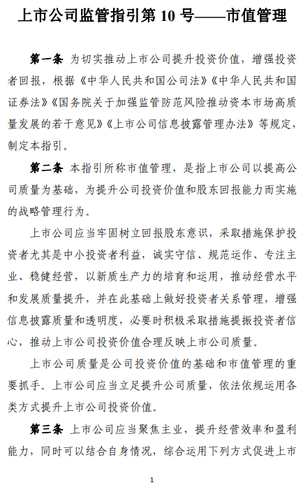 为贯彻落实《国务院关于加强监管防范风险推动资本市场高质量发展的若干意见》(国发〔2024〕10号),进一步引导上市公司关注自身投资价值,切实提升投资者回报,证监会制定了《上市公司监管指引第10号——市值管理》(以下简称《指引》),自发布之日起实施。