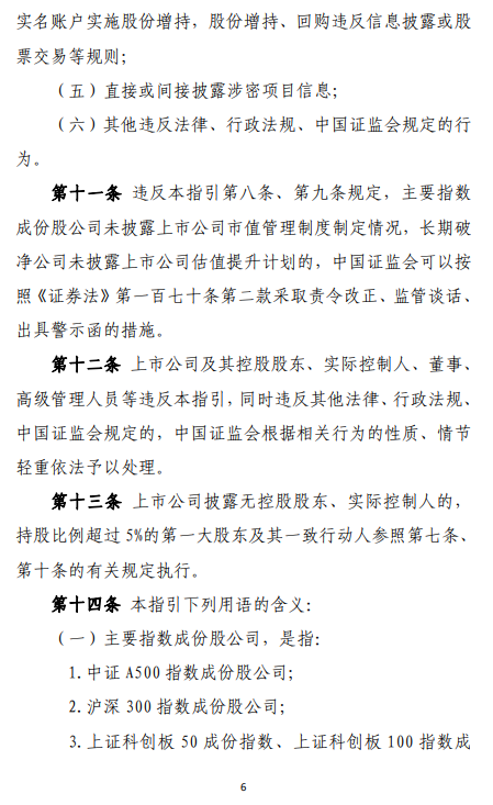 《指引》要求上市公司以提高公司质量为基础,提升经营效率和盈利能力,并结合实际情况依法合规运用并购重组、股权激励、员工持股计划、现金分红、投资者关系管理、信息披露、股份回购等方式,推动上市公司投资价值合理反映上市公司质量。《指引》明确了上市公司董事会、董事和高级管理人员等相关方的责任,并对主要指数成份股公司制定市值管理制度、长期破净公司披露估值提升计划等作出专门要求。同时,《指引》明确禁止上市公司以市值管理为名实施违法违规行为。 前期,证监会就《指引》向社会公开征求意见。从反馈情况看,各方总体认可《指引》,并结合实践提出了宝贵的意见和建议,涉及董事和高管人员职责、主要指数成份股公司范围、市值管理制度的披露要求、估值提升计划的执行情况等,经逐条研究,与《指引》条文有关的主要意见已采纳。后续,证监会将进一步加强政策解读,做好《指引》实施相关工作。