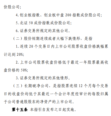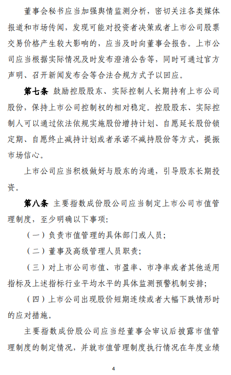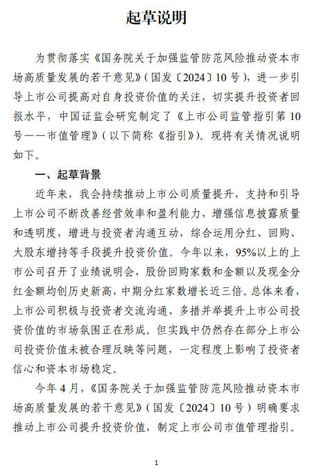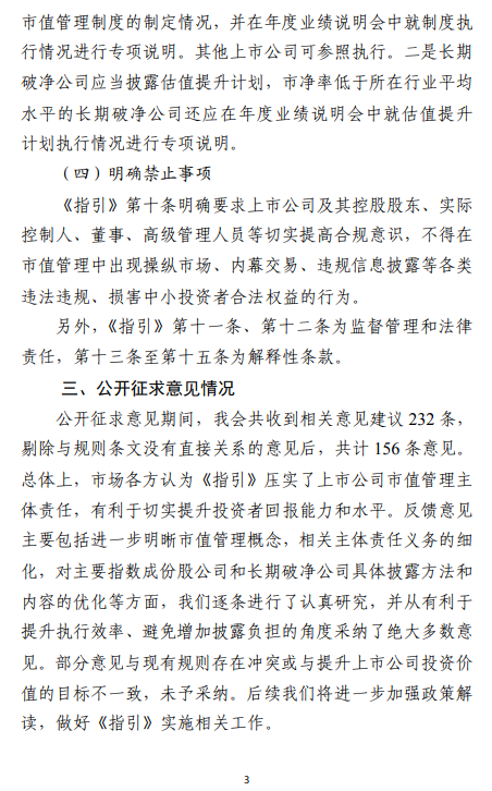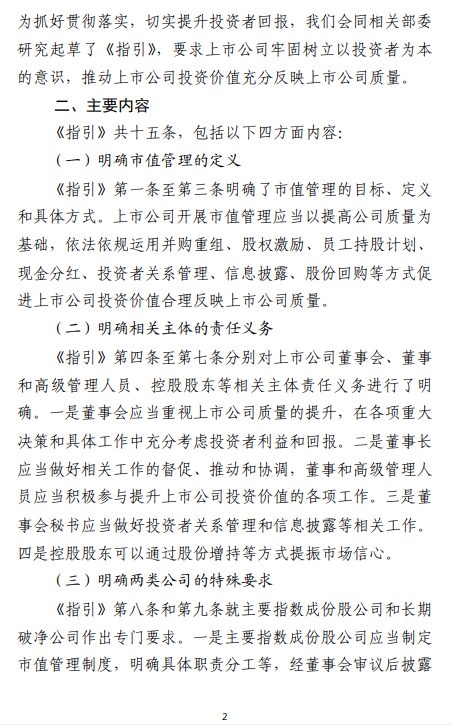详细报道证监会发布《上市公司监管指引第10号——市值管理》 为贯彻落实《国务院关于加强监管防范风险推动资本市场高质量发展的若干意见》(国发〔2024〕10号),进一步引导上市公司关注自身投资价值,切实提升投资者回报,证监会制定了《上市公司监管指引第10号——市值管理》(以下简称《指引》),自发布之日起实施。 《指引》要求上市公司以提高公司质量为基础,提升经营效率和盈利能力,并结合实际情况依法合规运用并购重组、股权激励、员工持股计划、现金分红、投资者关系管理、信息披露、股份回购等方式,推动上市公司投资价值合理反映上市公司质量。《指引》明确了上市公司董事会、董事和高级管理人员等相关方的责任,并对主要指数成份股公司制定市值管理制度、长期破净公司披露估值提升计划等作出专门要求。同时,《指引》明确禁止上市公司以市值管理为名实施违法违规行为。 前期,证监会就《指引》向社会公开征求意见。从反馈情况看,各方总体认可《指引》,并结合实践提出了宝贵的意见和建议,涉及董事和高管人员职责、主要指数成份股公司范围、市值管理制度的披露要求、估值提升计划的执行情况等,经逐条研究,与《指引》条文有关的主要意见已采纳。后续,证监会将进一步加强政策解读,做好《指引》实施相关工作。