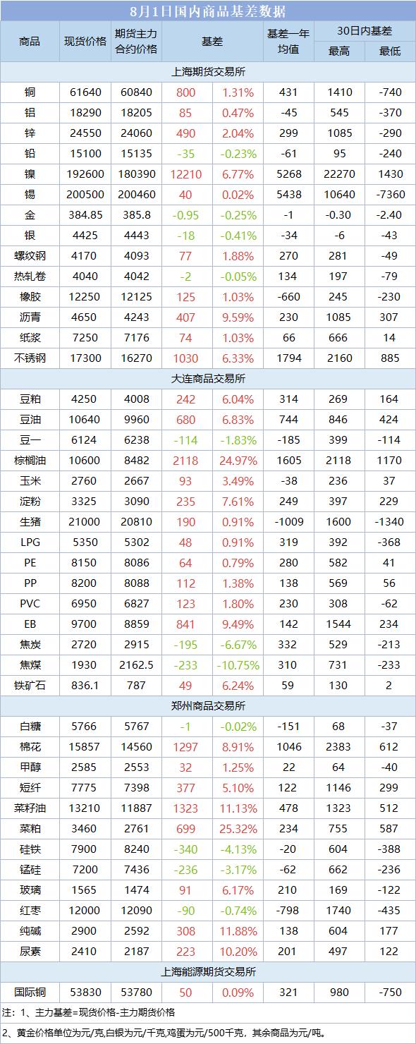 基差报告:8月1日国内商品基差数据一览