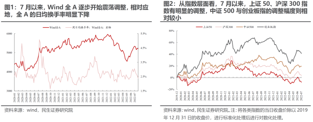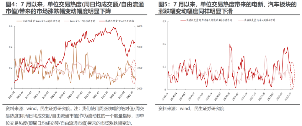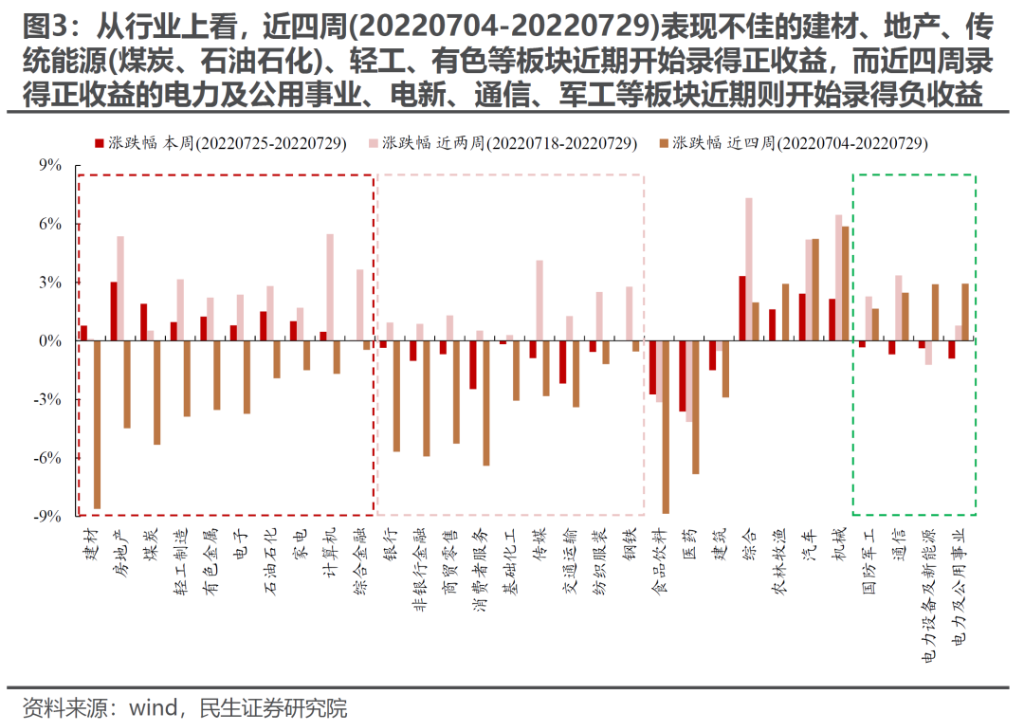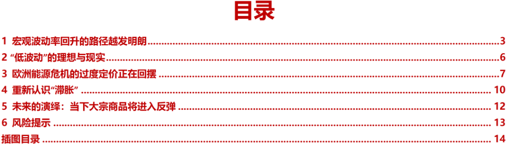 摘要1. 宏观波动率回升的路径越发明朗 我们在6月29日点评《为中国宏观波动率的回升做好准备》中提到“未来需要关注中国宏观经济波动性的回升,原有市场稳态结构即将被打破”。这一路径正在清晰:7月以来,宏观波动正在放大,市场逐步进入调整,投资者交易结构正逐步松动。然而,部分投资者仍然在押注中国经济的低波动,抱团于经济弱相关(并不免疫)的高增长部门。 2. “低波动”的理想与现实 主流投资者押注经济预期低波动的基础正是政策主线意图:“压低宏观波动率”。然而,政策意图低波动——宏观经济低波动——市场认知经济低波动之间并不画上等号。类似于2021年碳中和以来,政策本身意图是在传统能源稳定时加快新能源发展同时减少碳排放,但是中间由于经济复杂系统运行的规律,出现了限电限产和能源、原材料价格快速上涨等现象,而市场定价也出现了大幅波动。另外,我们在半年策略《暴雨惊雷》提到:房地产作为资本品,像预期中的低波动难度较大,对于地方财政压力将有所体现,而现在求稳本身又依赖于地方政府。最新一期PMI再次回落至荣枯线以下,疫情后的爬坡修复靠近尾声,疫情前的问题将重回投资者的视野。 3. 欧洲能源危机的过度定价正在回摆 前期投资者认为的衰退交易中,欧洲能源危机是主线。对于海外而言,(1)6月8日美国自由港爆炸以来,在欧洲能源危机的担忧下,市场定价“需求走弱,但欧洲更弱”的场景:美元指数走强、工业金属走弱、甚至北上交易型资金加速买入解决能源问题的光伏板块,光伏成为了中欧能源套利的最佳工具。值得注意的是,尽管工业金属需求受到冲击,其实也是超调的,同时供给在下行中得到了抑制而不是增加。这对于未来周期股的盈利提升埋下伏笔;(2)自拜登访问沙特以来,市场开始同时发生了变化:美元指数逐步走弱、工业金属筑底反弹。相应地,国内北上交易型资金也开始放缓甚至卖出光伏板块(此前配置盘已经开始卖出),发电设备板块开始顶部回落进入震荡。各类资产的一致走向背后暗含了市场开始定价发达国家“保供”的努力。同时,欧洲经济数据超预期(前期本身就是复苏遇到了能源短缺),正开始修正工业金属的担忧,而铜价在现货驱动下低库存驱动的上涨,表面供需仍然紧张,实物资产仍需重估。同时,美国经济进入“技术性”衰退,美元进一步走弱,验证了我们此前讨论的美国进入衰退后大宗商品是上涨而非下跌的观点。 4. 重新认识“滞胀” 美林时钟的分析框架在中国深入人心,导致了国内投资者简单认为进入学术鉴定的“衰退”后就没有了通胀,混淆了学术上衰退与美林时钟衰退的概念,这让对通胀的理解陷入了“需求驱动”的陷阱。美林时钟本身并不具有学术依据,其“滞胀期”更多是过热后期的一种特征。而以美国70年代为例,我们现在讨论的“滞胀”时期,都是NBER划分的衰退期。这意味着进入“衰退”后,真正的滞胀时期才真正开始。 5. 未来的演绎:当下大宗商品将进入反弹 后续关注:(1)如果能源危机可以相对缓解(关注俄乌冲突、OPEC会议等)。工业金属(铜、铝)的反弹趋势将进一步强化。此时对于能源板块并非实质利空,类似于煤炭保供后新一轮股票行情的开始,毕竟能源供给仍然紧张,有利于需求释放。(2)如果能源危机仍未缓解或者加速,那么能源价格将进一步上行,加速能源通胀交易,黄金的全面机会期将更快来临。继续推荐:油、黄金、油运,动力煤;工业金属(铜、铝)未来反弹可能超市场预期;房地产;成长推荐:军工、元宇宙。 风险提示:地产下行对经济影响有限,海外超预期衰退,测算误差。 ![]() 报告正文1、宏观波动率回升的路径越发明朗 我们在6月29日点评《为中国宏观波动率的回升做好准备》中提到“未来需要关注中国宏观经济波动性的回升,原有市场稳态结构即将被打破”。这一路径正在清晰:7月以来,宏观波动正在放大,市场逐步进入调整,投资者交易结构正逐步松动。自7月以来,Wind全A逐渐步入震荡调整格局,指数层面则呈现了明显的分化:上证50、沪深300指数有明显的调整,中证500、创业板指的调整幅度则相对较小。 ![]() 行业层面,我们同样看到了结构在逐步松动:前期强势赛道的上行动能在逐步减弱,而部分前期弱势板块则开始逐步占优。具体而言,一方面7月以来整体表现不佳的建材、地产、传统能源(煤炭、石油石化)、轻工、有色等板块近期开始录得正收益;另一方面,7月以来表现居前的电力及公用事业、电新、通信、军工等板块近期则开始录得负收益。值得一提的是,7月以来食品饮料、医药、建筑等板块始终表现不佳。 ![]() 从流动性视角来看,如果我们以单位交易热度(周日均成交额/自由流通市值)带来的市场涨跌幅变动幅度作为流动性度量的指标发现:7月以来,单位交易热度带动市场涨跌幅变动幅度的明显下降。相似的,电新、汽车等板块呈现了同样的特征。这同样指示着市场以及前期强势板块上行动能的走弱。如果结合投资者行为来看我们发现:7月以来,无论是各类投资者、还是趋势交易者内部,整体分歧在明显扩大,这意味的是投资者原有共识的明显松动。7月以来,部分投资者可能已经开始逐步寻找新的方向,而部分投资者其实仍然在押注中国经济的低波动,抱团于和经济弱相关(并不免疫)的高增长部门。 ![]() ![]() 2、“低波动”的理想与现实 主流投