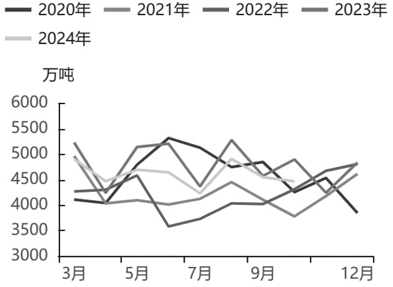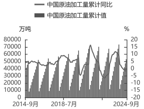 图为中国原油加工量累计值及累计同比 1—10月,我国原油进口量累计达到4.57亿吨,累计同比下降3.46%;1—10月,我国原油加工量累计达到5.9亿吨,同比下降2%。2024年,低利润、低需求持续抑制国内炼厂开工负荷。从终端消费来看,柴油消费受影响较为明显。1—9月,我国成品油(汽柴煤合计)表观消费量累计达到2.89亿吨,同比下降0.21%,其中汽油、柴油、航空煤油表观消费量同比分别增长3.33%、下降5%、增长12.55%。1—9月,国内民航周转量同比增长18.3%,推动了国内航空煤油消费的增长。EIA、IEA、OPEC预计2024年中国原油消费分别增长9万桶/日、10万桶/日、40万桶/日,2025年增幅分别为26万桶/日、20万桶/日、30万桶/日。 原油供给端不确定性加大