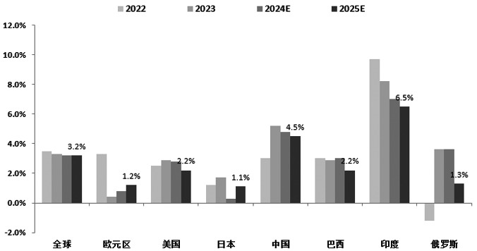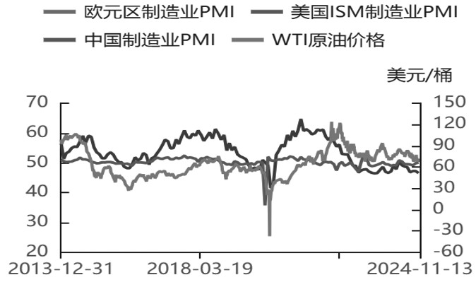 2024年,全球经济整体表现低迷,虽然上半年全球制造业PMI一度回升至50以上,但下半年再度陷入萎缩区间,欧洲制造业PMI在年内持续处在萎缩区间。截至10月底,中国、美国及欧洲制造业PMI分别录得50.1、46.5和46,中国制造业在时隔半年后重回扩大区间,而欧洲制造业PMI已连续两年多处在萎缩区间。制造业疲软持续拖累经济,IMF预计2024年全球经济增速将达到3.2%,低于2023年。