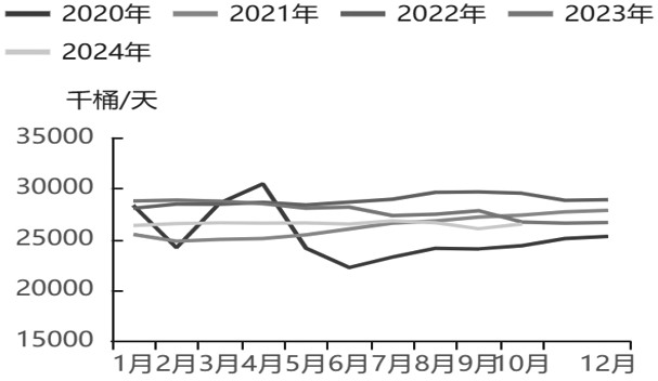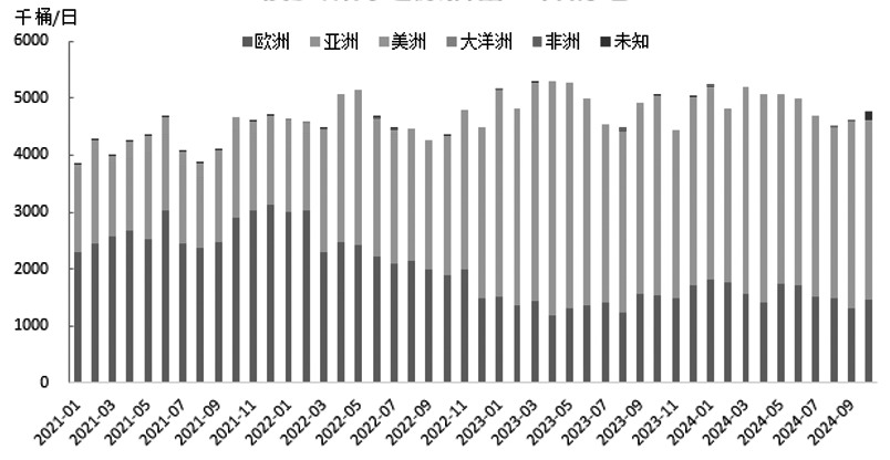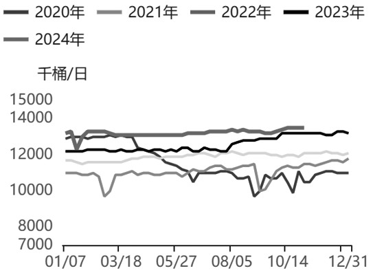 图为OPEC原油产量 2024年,OPEC+持续减产令全球原油供给维持低水平。1—10月,OPEC原油总产量同比下降5%,OPEC+原油总产量较2023年年底也有明显回落,同时OPEC+海运原油出口量同比减少3.45%。6月初,OPEC+会议释放了增产信号:此前在2023年11月实施的220万桶“自愿减产”在2024年10月至2025年9月底将视情况逐步取消,此后又将退出时间点推迟至12月底;此外,OPEC+同意将阿联酋2025年的产量配额提高30万桶/日,至351.9万桶/日。OPEC+此次会议是一个重要转折点,过去几年,在全球原油消费表现低迷的背景下,OPEC+通过持续减产维持原油市场的相对平衡,并支撑了油价,而随着经济复苏带动原油消费逐步恢复,OPEC+也开始转向注重提升自身产量以提高财政收入。 2025年,在政策变化预期下,OPEC+供给预计将有所回升,但鉴于当前全球经济及原油消费依旧疲弱,OPEC+增产步伐预计相对缓慢,以弱化对油价的冲击。而特朗普上台后,预计将加大对产油国政策的干预,尤其是沙特在产量政策方面的态度将受到美国的干扰,这也给OPEC+的政策走向带来不确定性。 2024年上半年,俄罗斯炼厂频繁遭遇无人机袭击,导致该国炼厂炼油产能损失一度达到20%,这间接促进了俄罗斯原油的出口。3月,俄罗斯海运原油出口达到520万桶/日,创近1年来新高,而此后随着炼厂逐步恢复生产,俄罗斯原油出口有所回落。俄乌冲突爆发后,欧美对运输俄罗斯原油的船只实施了制裁,2024年被制裁的船只逐步恢复运输俄罗斯原油,这一趋势自2024年4月以来逐步增强,被制裁的船只在不使用西方国家的保险服务以及不停靠西方国家港口的情况下,将不会受到潜在的处罚,这令这部分船只再度活跃起来,进而助推了俄罗斯原油的出口。 目前,西方国家对俄罗斯的制裁趋于常态化,但俄罗斯仍然通过非常规手段保持原油出口的稳定性,特朗普就任后,可能会促进俄乌冲突结束,不过即便如此,西方国家仍可能继续保持对俄罗斯的制裁,俄罗斯原油供给仍会面临一些变数。 2024年,美国原油产量增长有所放缓。EIA短期能源展望报告显示,11月美国原油产量预计为1344万桶/日,较10月的1345万桶/日略有下降;12月预计为1352万桶/日。预计2024年美国原油产量将增加30万桶/日,而2023年美国原油产量增加100万桶/日。 目前美国页岩油上游投资活动景气度仍然不高,从美国达拉斯联储的调查数据来看,美国第十一区的130多家原油和天然气公司的能源活动自2022年以来持续下降,且2024年三季度能源公司的商业活动、资本支出及前景展望等指标环比及同比均大幅走低,在当下能源活动处于低景气度背景下,各能源公司也不看好未来的发展前景。二叠纪地区钻井活动要明显好于其他48州,先进的钻井和完井技术推进了该地区页岩油产量的增长。而在过去的几年,二叠纪地区原油和天然气产量的增长也受到了外输能力的限制,但这样的局面未来将有所改善。Enbridge宣布,将在2025年年底前将其Gray Oak管道运输量扩大12万桶/日,以增加二叠纪盆地开采的原油的运输能力;而新的天然气管道Matterhorn管道于2024年三季度投入使用,也将增强天然气的外输能力。 此外,特朗普强调美国能源独立,支持传统石化产业,其上任后或加快发放原油、天然气勘探许可,这意味着未来美国油气行业产出将再度受到政策支持。但由于当前美国页岩油主产区中联邦土地的使用率已超过90%,因此即便未来政策利好美国油气行业,对美国原油产出的整体影响相对有限。EIA、IEA、OPEC预计,2024年美国原油产量增幅分别为29万桶/日、70万桶/日、60万桶/日,其中页岩油产量预计仍将保持增长,增量主要将来自Permian。但传统原油产量有可能出现下降,同时EIA、IEA、OPEC预计2025年美国原油产量增幅分别为31万桶/日、70万桶/日、50万桶/日。 全球原油消费难言乐观 2024年,全球经济持续低迷,原油消费表现并不乐观,近几个月机构连续下调原油需求预期,大部分机构预计2024年全球原油需求增速将出现下降。EIA、IEA、OPEC预计,2024年全球原油消费增幅分别为100万桶/日、90万桶/日、182万桶/日;EIA和IEA对原油需求增幅的预测不及2023年一半的水平。2024年,非OECD国家仍然是原油需求增长的主力,预计将贡献大部分的需求增量,印度原油需求增量相对较大,而中国原油需求增长放缓。2025年,全球经济预计难有起色,原油消费将继续受制约,从各机构的预测来看,2025年全球原油需求增速将进一步回落,EIA、IEA、OPEC预计2025年全球原油消费增幅分别为122万桶/日、100万桶/日、154万桶/日。目前来看,增幅预测普遍略高于2024年,但各机构后期对原油消费增幅进一步向下修正的可能性较大。2025年,非OECD国家仍将供应大部分需求增量,包括中国、印度等国家,航空煤油仍将是需求增长较快的原油产品。