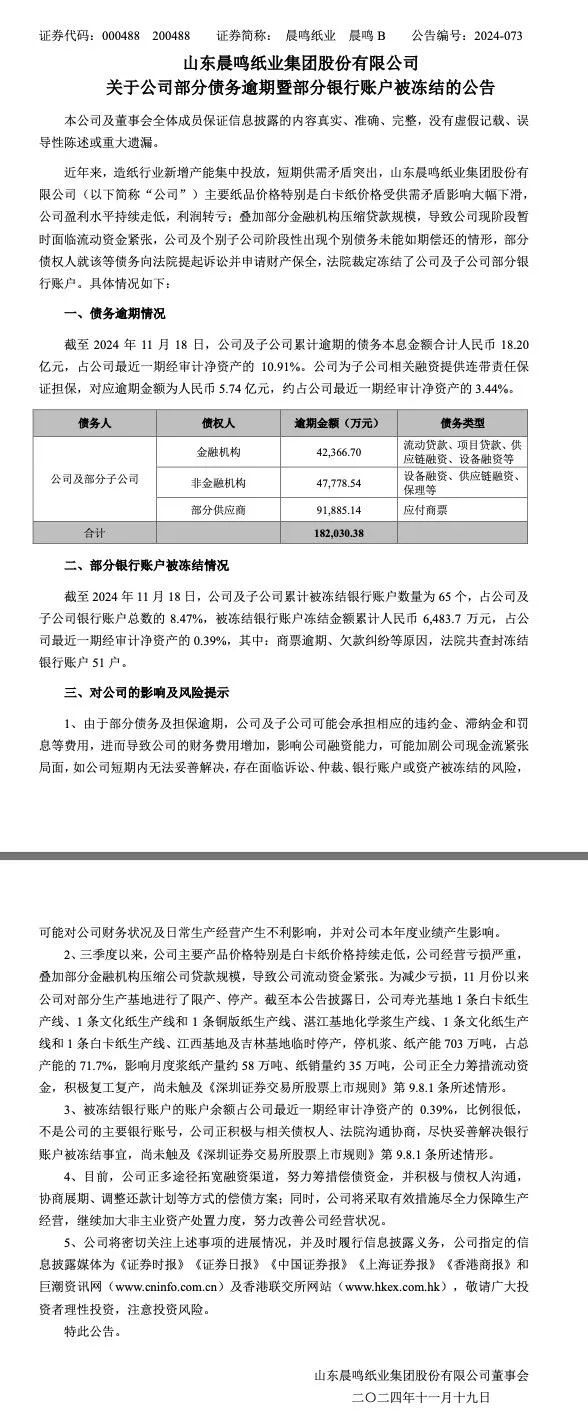 “纸茅”大规模停产! 11月20日,晨鸣纸业股价暴跌,港股方面,晨鸣纸业开盘一度跌停,收盘跌超22%。 11月19日晚,晨鸣纸业发布公告称其多条生产线临时停产,停机浆、纸产能703万吨,占总产能的71.7%,影响月度浆纸产量约58万吨、纸销量约35万吨。 白卡纸价格持续走低,纸业龙头亏损严重 11月19日晚间,纸业龙头晨鸣纸业发布公告,披露了公司部分债务逾期暨部分银行账户被冻结的情况。 公告显示,截至11月18日,晨鸣纸业及其子公司累计逾期的债务本息金额合计人民币18.20亿元,占公司最近一期经审计净资产的10.91%。公司为子公司相关融资提供连带责任保证担保,对应逾期金额为人民币5.74亿元,约占公司最近一期经审计净资产的3.44%。 公告称,三季度以来,公司主要产品价格特别是白卡纸价格持续走低,公司经营亏损严重,叠加部分金融机构压缩公司贷款规模,导致公司流动资金紧张。为减少亏损,11月份以来公司对部分生产基地进行了限产、停产。公司正全力筹措流动资金,积极复工复产,尚未触及《深圳证券交易所股票上市规则》第9.8.1条所述情形(即不会被实施其他风险警示)。 截至本公告披露日,晨鸣纸业寿光基地多条生产线临时停产,停机浆、纸产能703万吨,占总产能的71.7%,影响月度浆纸产量约58万吨、纸销量约35万吨。 ![]() 据国泰君安期货研究院纸浆期货高级研究员高琳琳介绍,白卡纸是晨鸣纸业的主要产品之一。晨鸣纸业2024年半年报显示,双胶纸、白卡纸、铜版纸和静电纸营收占比分别为26.72%、21.08%、17.34%、14.68%,上述四大机制纸营收合计占比约80%。而其白卡纸近两年利润下降明显,报告期内晨鸣纸业双胶纸、白卡纸、铜版纸和静电纸毛利率分别为12.98%、-4.56%、21.16%、21.05%,白卡纸毛利率同比下降1.56%,2023年半年报中白卡纸毛利率同比下降20.88%。 高琳琳表示,白卡纸利润持续走低的原因主要是近年来白卡纸新增产能大量投放,市场整体供大于求,纸价不断下跌。 隆众资讯数据显示,2019—2023年中国白卡纸产能复合增长率达9.9%。分阶段来看,2019—2020年受行业投产周期影响,新增产能增速放缓;2021年,市场迎来产能投产爆发期,2021—2023年白卡纸新增产能分别达到230万吨、160万吨、200万吨,行业产能增长率高达16.4%、8.9%、8.4%。 大地期货纸浆研究员赵晨雨告诉记者,今年白卡纸行业确实面临巨额亏损的情况,10月份有白卡纸生产企业发布涨价函,但涨价难以落地。纸厂亏损倒逼行业产能出清,理论上会导致行业集中度提高,供需格局更加合理,长远来看有利于纸价企稳回升。 方正中期期货纸浆分析师汤冰华告诉记者,近两年造纸行业利润持续下滑。 据汤冰华介绍,2021年二季度开始成品纸价格持续走低,白卡纸价格跌幅超50%,文化纸价格也下跌近30%,同期针叶木浆价格下跌20%,阔叶浆下跌30%,原料跌幅整体小于成品纸,导致纸厂利润持续下滑。国家统计局数据显示,2022年造纸行业利润下降30%,2023、2024年虽有回升,但利润绝对值依然偏低,且从成品纸盈利情况来看,部分纸种价格处于盈亏平衡线附近,利润持续低迷导致企业生产意愿较低。 昨日,广东某大型纸业公司市场部人士曾对媒体表示,近两年纸业需求下降,市场供需进一步失衡,今年以来不少纸品比如生活用纸巾都在大力促销,利润非常低。 记者注意到,11月8日晚,在晨鸣纸业工作了37年的陈洪国宣布辞去董事长一职,其夫人李雪芹也辞去了公司副总经理一职。接棒董事长的是1987年加入晨鸣纸业的元老级人物胡长青。 公开资料显示,成立于1993年的晨鸣纸业是国内造纸行业中产品种类最多的企业,产品系列涵盖文化纸、白卡纸、铜版纸、复印纸、生活纸、热敏纸等,主要产品的市场占有率较高。 “纸茅”停产,纸浆会受到影响吗? 考虑到晨鸣纸业是行业龙头企业,且晨鸣纸业此次限产、停产产能较多,高琳琳预计,双胶纸供应宽松格局将有所缓解。在她看来,晨鸣纸业限产、停产后,预计其他纸企增产铜版纸较多,白卡纸其次,增产双胶纸意愿较弱。 钢联数据显示,截至11月15日,铜版纸生产利润在三者中最高,开工率约54%,开工率可提升空间较大,预计其他纸企将弥补晨鸣纸业的铜版纸供给缺口。白卡纸生产利润处于历史低位,利润微薄,开工率约70.3%,其他纸企增产意愿较弱。双胶纸生产利润近期持续为负,纸企增产意愿较弱。 汤冰华表示,晨鸣纸业年产能约1100万吨,其中木浆产能430万吨,制浆与造纸产能基本平衡。此次停产预计影响月度浆、纸产量约58万吨,纸销量约35万吨,停产纸种包括白卡纸、文化纸,因此停产影响的纸销量大约占全国白卡纸和文化纸供应量的12%,停产时间若较长,文化纸及白卡纸供需情况有望好转,价格也将上涨,但考虑到近几年全国成品纸新增产能较多,因此若纸价上涨且生产利润回升,将增强其他企业生产意愿,届时成品纸产量将增加。 对纸浆而言,由于晨鸣纸业基本实现浆、纸平衡,因此其停产对纸浆供需影响较小,但国内浆纸一体化企业纸浆生产以阔叶浆为主,针叶浆较少,因此晨鸣纸业停产将影响针叶浆需求。成品纸价格一旦回升,则纸浆价格也有望跟随回升,预计纸浆价格仍将保持宽幅震荡。 据赵晨雨介绍,9月以来,纸浆期货价格保持宽幅震荡。市场存在海外累库、国内“旺季不旺”、纸价偏弱等利空因素,但价格已接近成本线,继续下行空间有限;利多因素包括成本支撑、供应扰动、针叶浆去库等,但不足