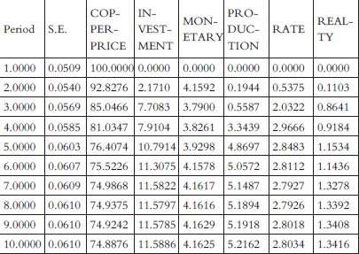 上述公式中,y是k维内生变量,x是d维外生变量,p是滞后阶数,kxk维矩阵A和 kxd维矩阵B是待估计的系数矩阵,ε是随机误差项,滞后阶数p可以根据信息准则AIC和SC的取值最小来确定。 对变量的平稳性进行检验。六个序列均是一阶单整序列,一阶差分后可以建立VAR模型。由VAR模型滞后阶数的检验结果发现,3阶VAR模型是最合适的。AR根检验结果得出,VAR模型所有根模的倒数小于1,模型是稳定的。 脉冲响应分析 脉冲响应分析是一种用于研究时间序列模型中变量之间动态关系的方法。在脉冲响应分析中,“脉冲”指的是对某个变量施加一个短暂的、突发的冲击(如增加1个单位值),观察这个冲击对其他变量的影响。“响应”指的是在施加脉冲后,其他变量如何随时间变化。我们想知道这个冲击会在多大程度上影响其他变量,以及这种影响会持续多久。 图1报告了铜价对利率因子、工业生产因子、房地产因子、货币因子、投资因子的脉冲响应结果。给铜价1个正冲击后,对自身造成0.05%的正冲击,然后快速衰减,到第4期衰减至零附近。可以看到,每个因子都起到了一定正向冲击作用,但铜价自身和中国投资因子的影响较大,房地产因子起到的作用则很小。 方差分解 方差分解是一种统计方法,目的是将一个变量的总方差分解成多个部分,以便了解不同因素对这个变量波动的贡献。相对于脉冲响应分析,其可以进一步评价不同结构冲击的力度。滞后10期内每个因素对铜价格波动的影响权重系数矩阵,每行的权重系数之和均为100%。数值越大,表明该期某因素对铜价变化的影响越大。由表2可知,铜价波动主要受自身影响,最开始标准差完全自身承载,一直到10期,自身承载仍达到74%。各因子对铜价波动的影响程度依次为投资因子>工业生产因子>货币因子>利率因子>房地产因子。随着时间的推移,各影响因子对铜价波动的作用逐渐明显,其中投资因子在第5期后开始对铜价有极其显著的影响。